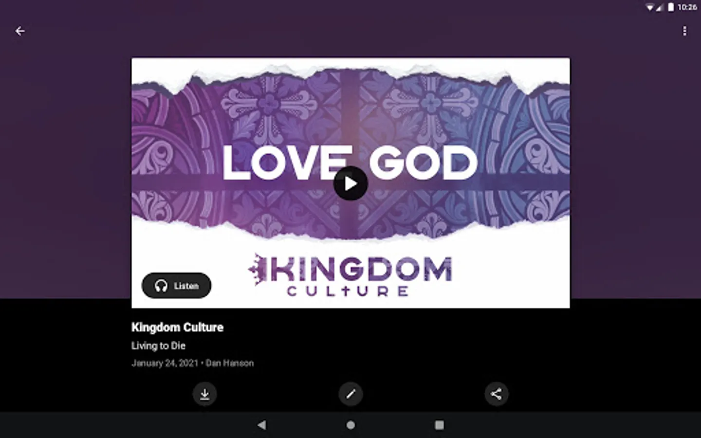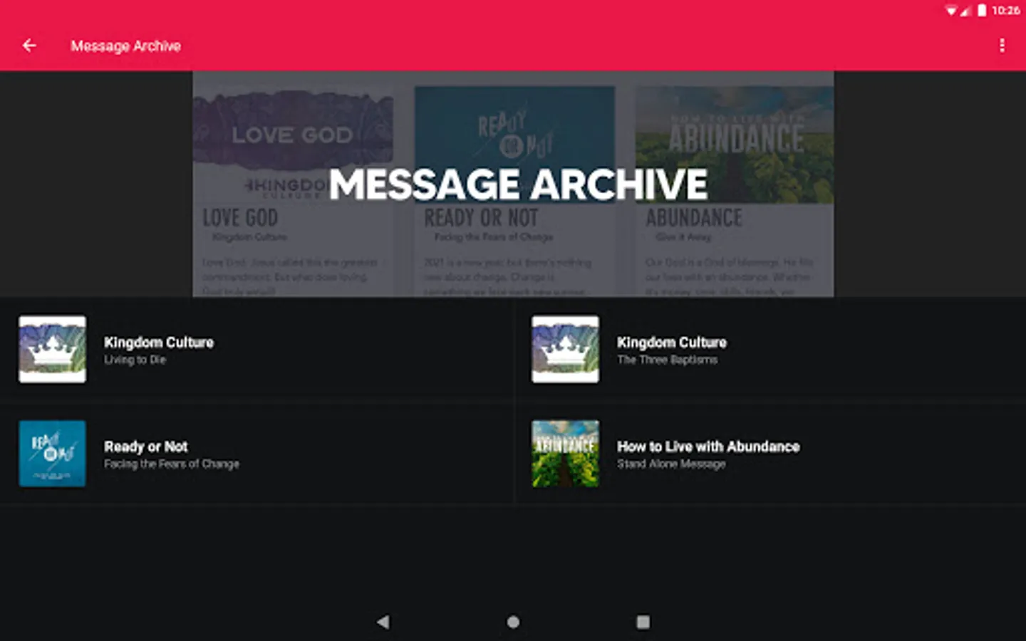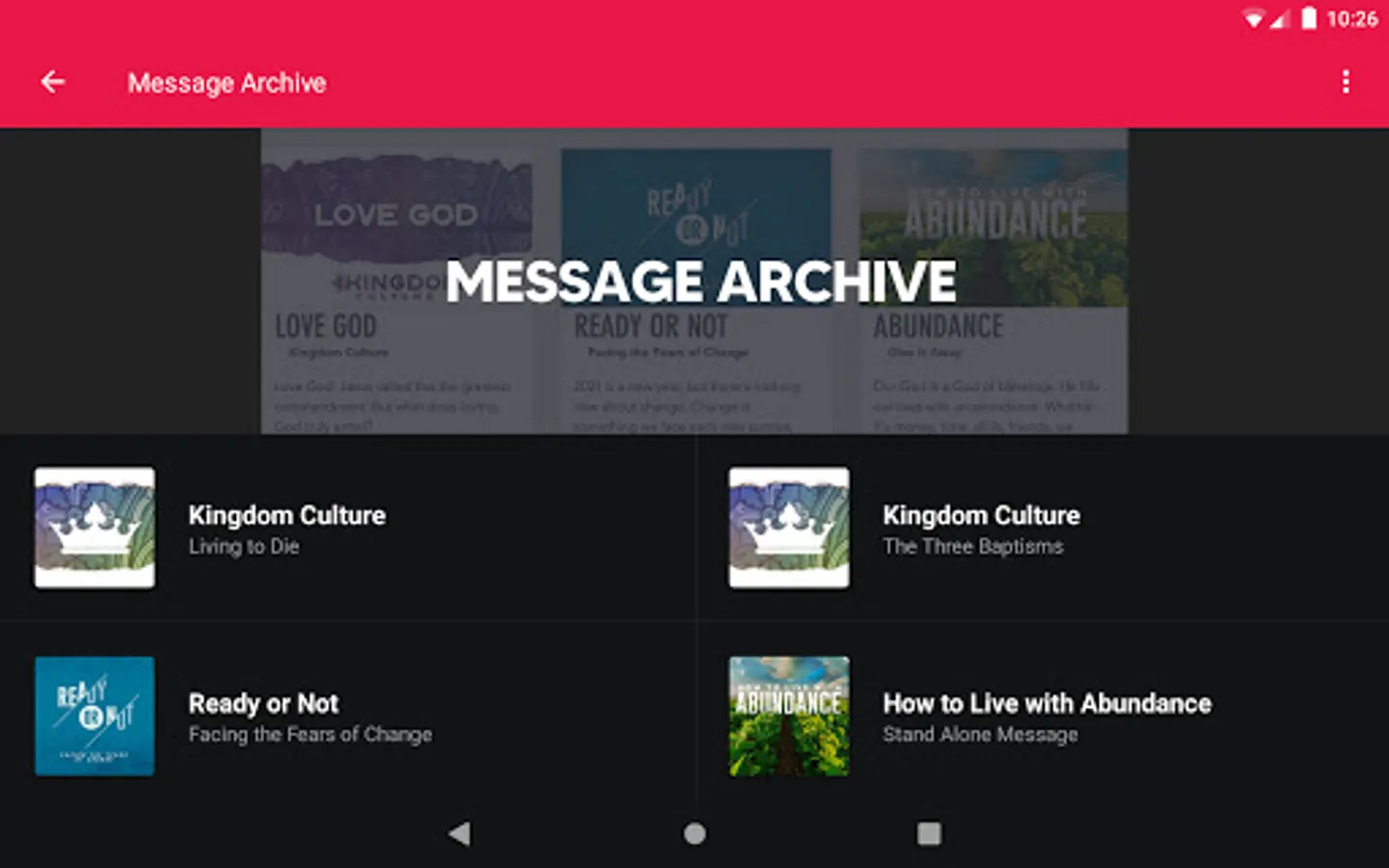 This app will help you stay connected with the day-to-day life of our community of faith. With this app, you can: watch or listen to past messages; stay up to date with push notifications; share your favorite messages via Twitter, Facebook, or email; and download messages for offline listening.