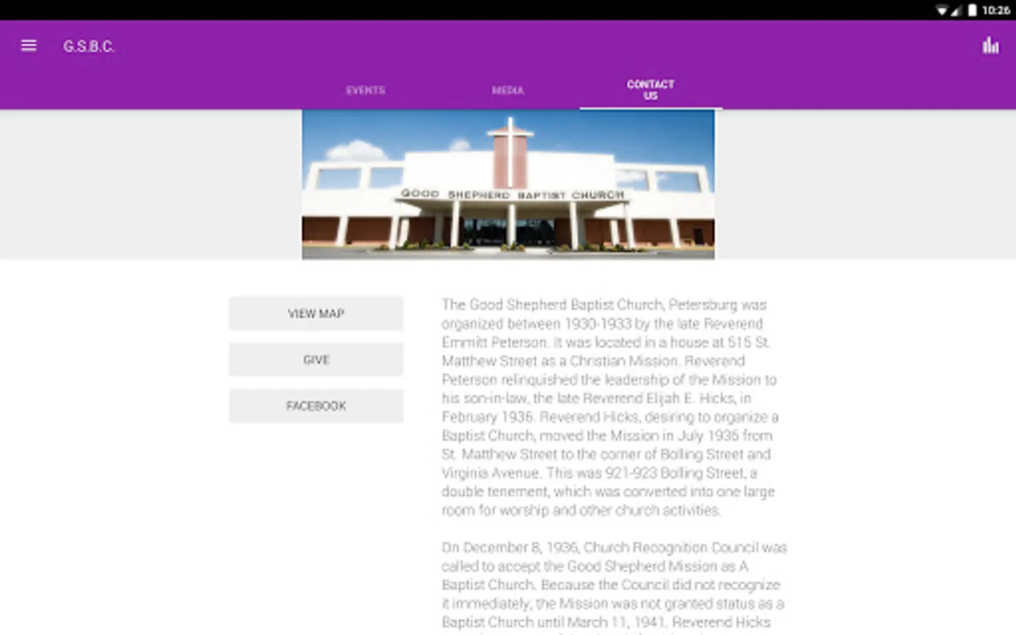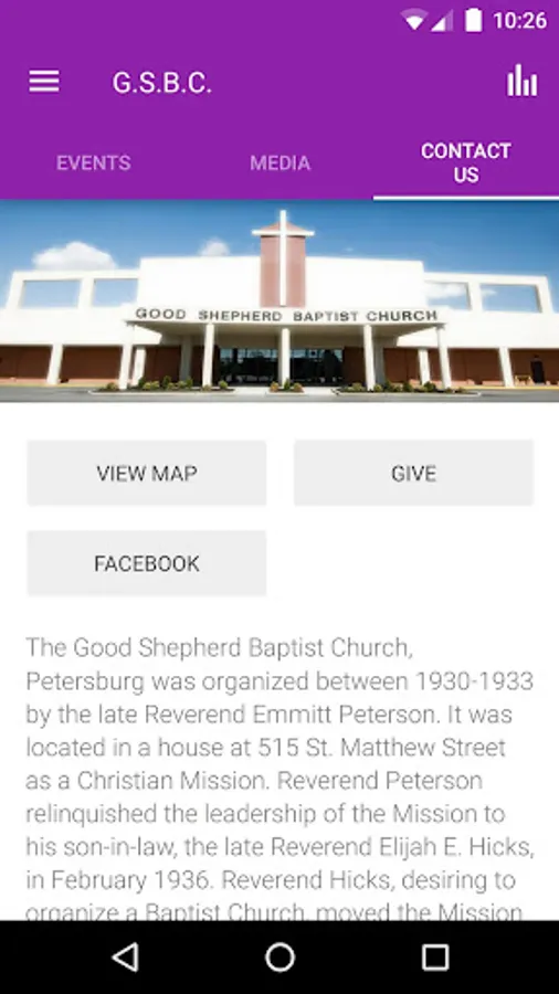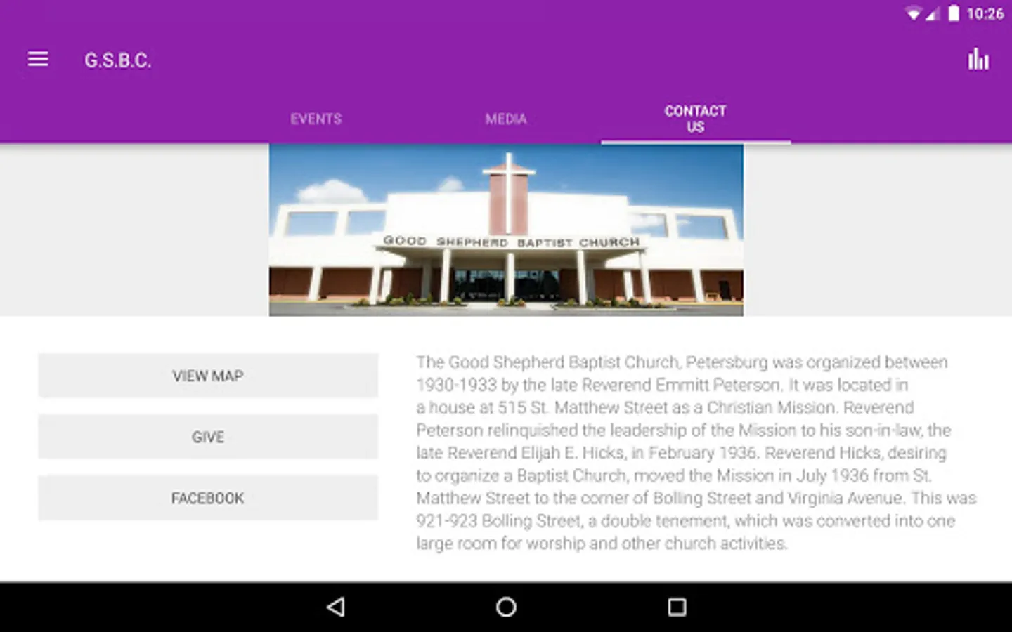The Good Shepherd Baptist Church, Petersburg, Virginia, was organized between 1930-1933 by the late Reverend Emmitt Peterson. It was located in a house at 515 St. Matthew Street as a Christian Mission. Reverend Peterson relinquished the leadership of the Mission to his son-in-law, the late Reverend Elijah E. Hicks, in February 1936. Reverend Hicks, desiring to organize a Baptist Church, moved the Mission in July 1936 from St. Matthew Street to the corner of Bolling Street and Virginia Avenue. This was 921-923 Bolling Street, a double tenement, which was converted into one large room for worship and other church activities.