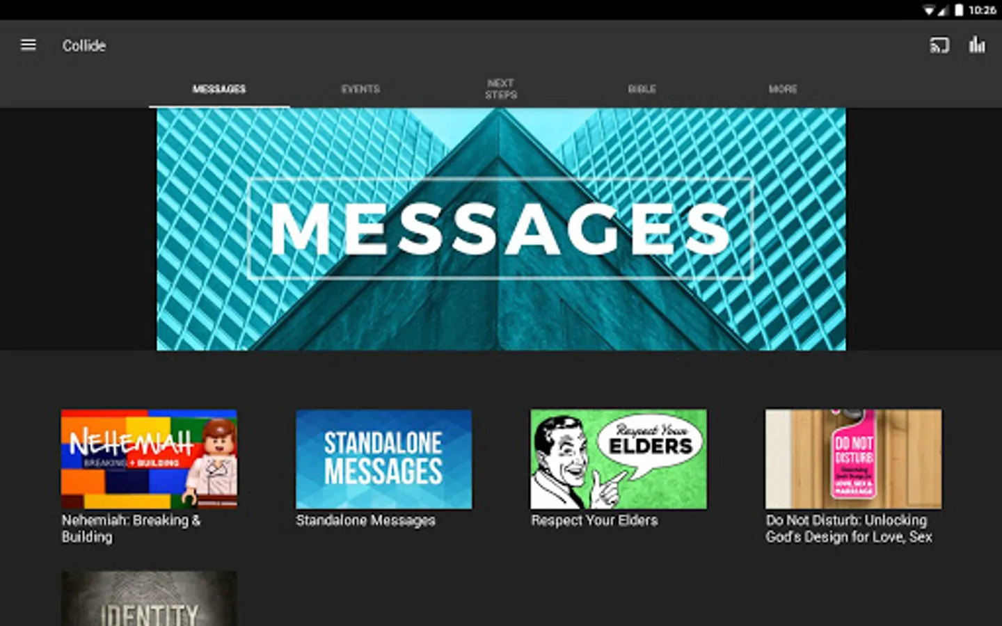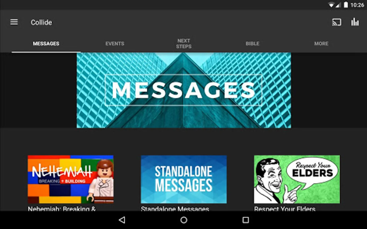The Collide Church app gives you instant access to messages from our Teaching Pastor, Elder Team and other guest speakers. It also connects you with discussion guides, event information, next steps and many more resources from Collide Church. You can also share the content with others via Facebook, Twitter or email.