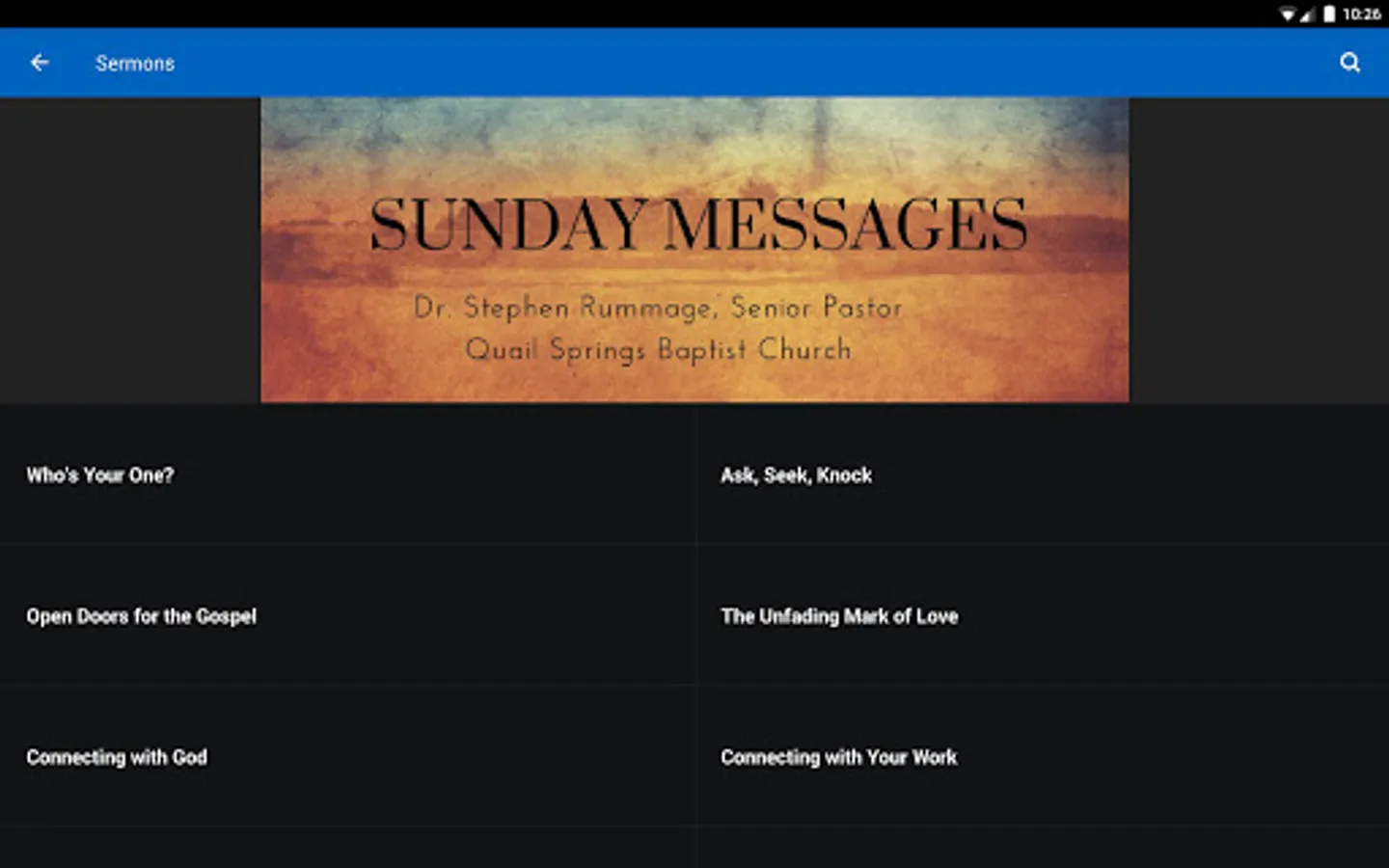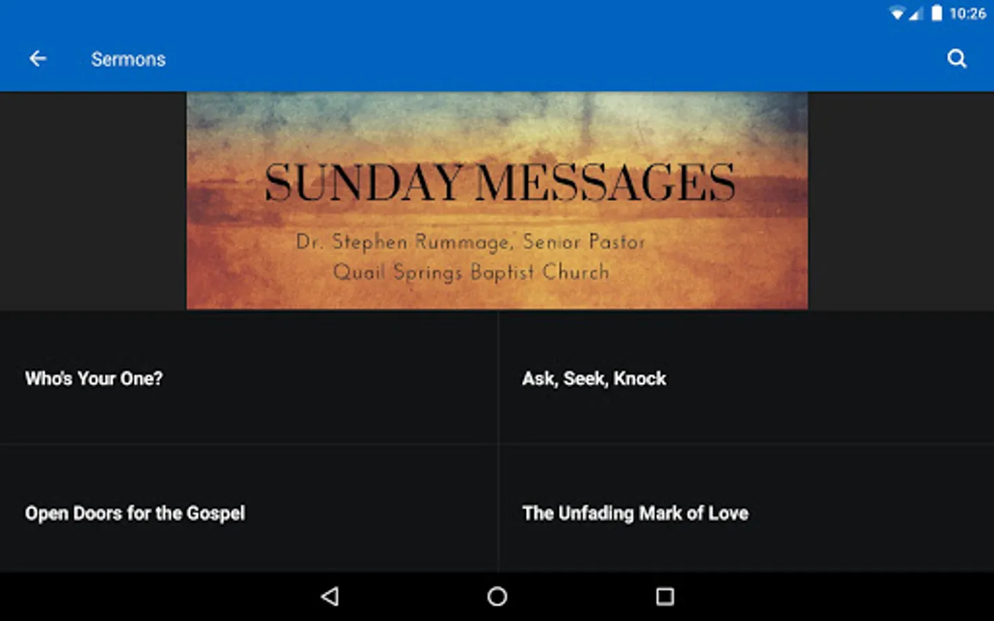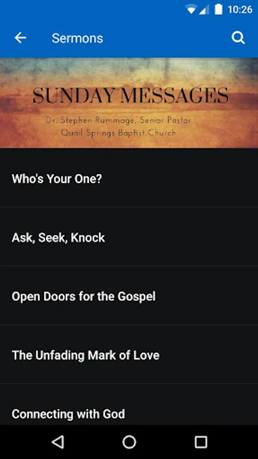 This app features content from Dr. Rummage's radio program, Moving Forward with Dr. Stephen Rummage, as well as an archive of messages preached where he serves as senior pastor of Quail Springs Baptist Church. Share interesting content with friends via Facebook, Twitter, or email.