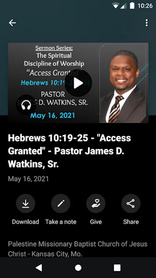 This is the official app for Palestine Missionary Baptist Church of Jesus Christ. This FREE app will help you stay connected with what's happening in our church. When you download the app, you can watch sermons anytime, view announcements, access online giving, and more.