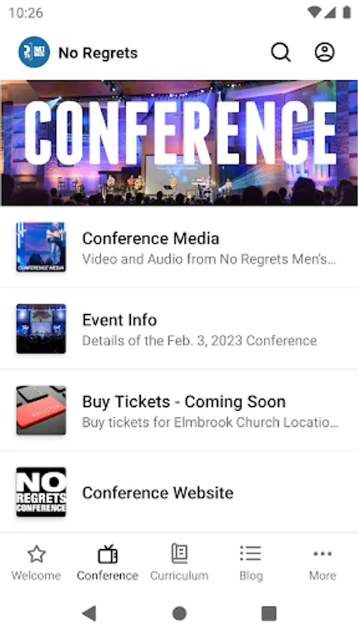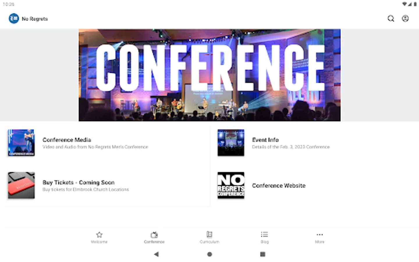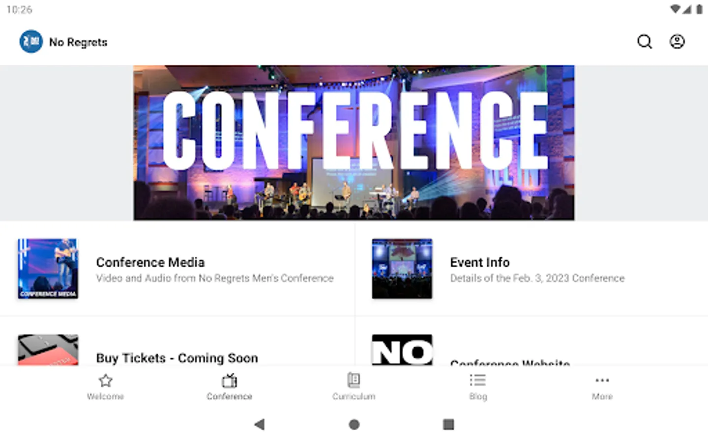 The annual No Regrets Christian men's conference, on the first Saturday in February, seats 4000 men at Elmbrook and reaches more than 10,000 men at host sites scattered across North America. This new kind of conference technology makes it possible for churches of any size or location to reach more of their own men. This app includes free conference video platform messages and free audio breakout sessions that can be used over and over again in your men's ministry.