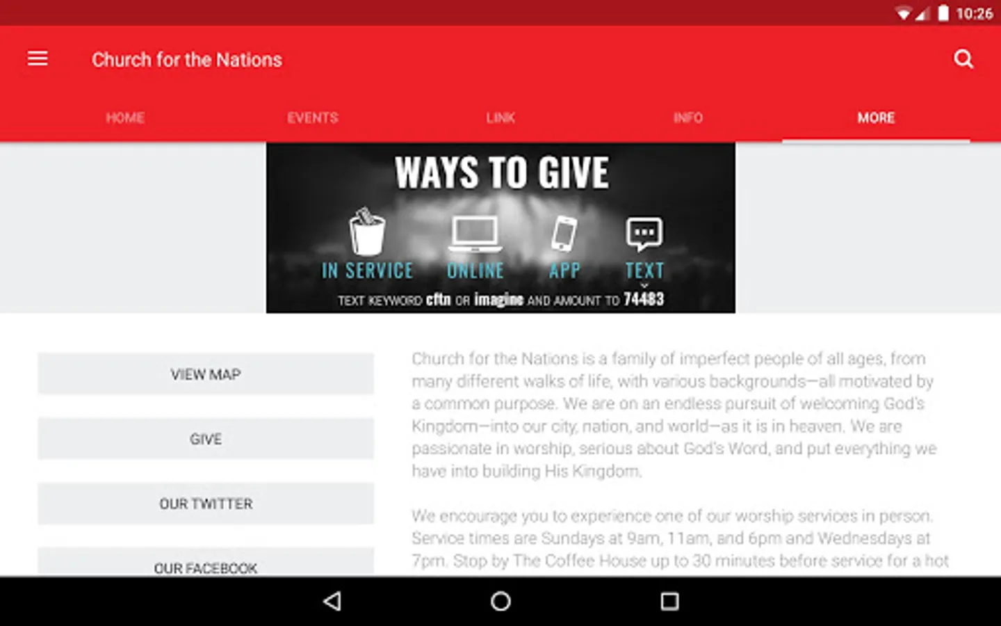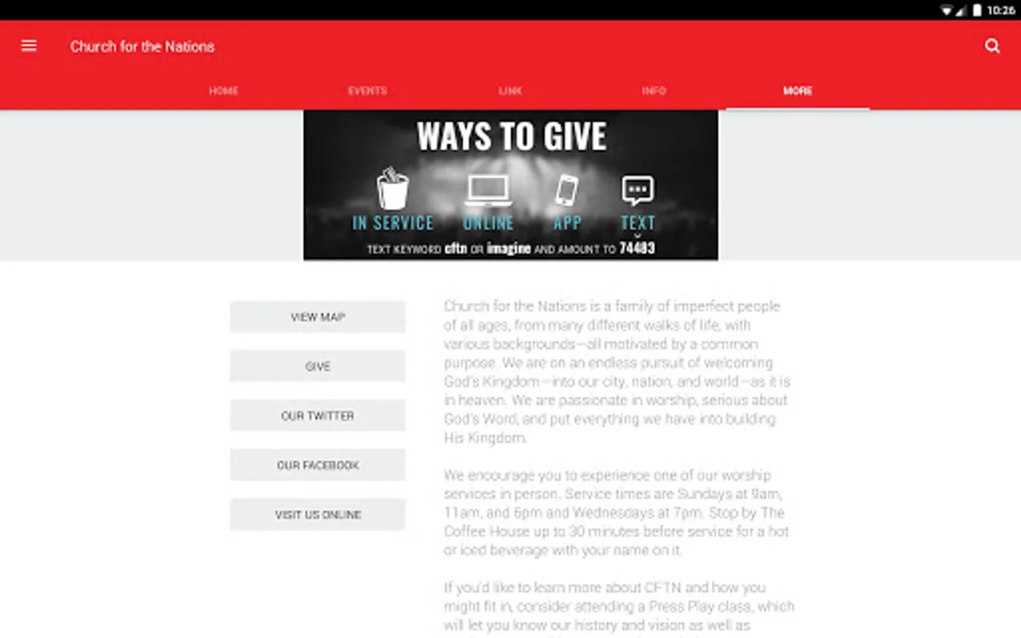 Whether it's learning more about CFTN ministries or signing up for interest-specific notifications, this app will help you stay up to date with all things CFTN. It is our desire that as you use the app, you feel more connected to your church family.