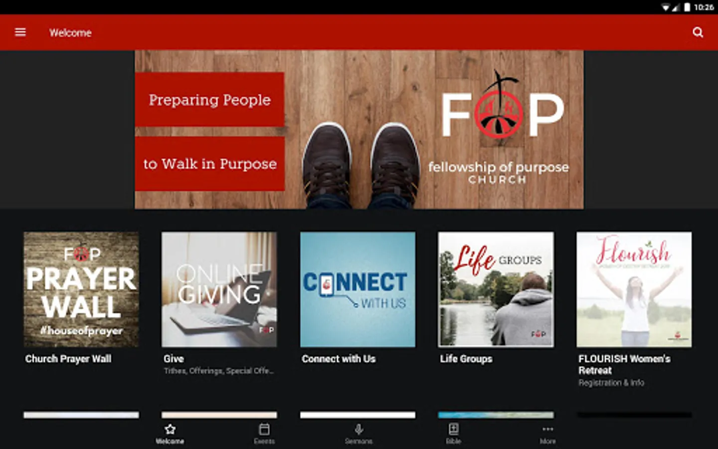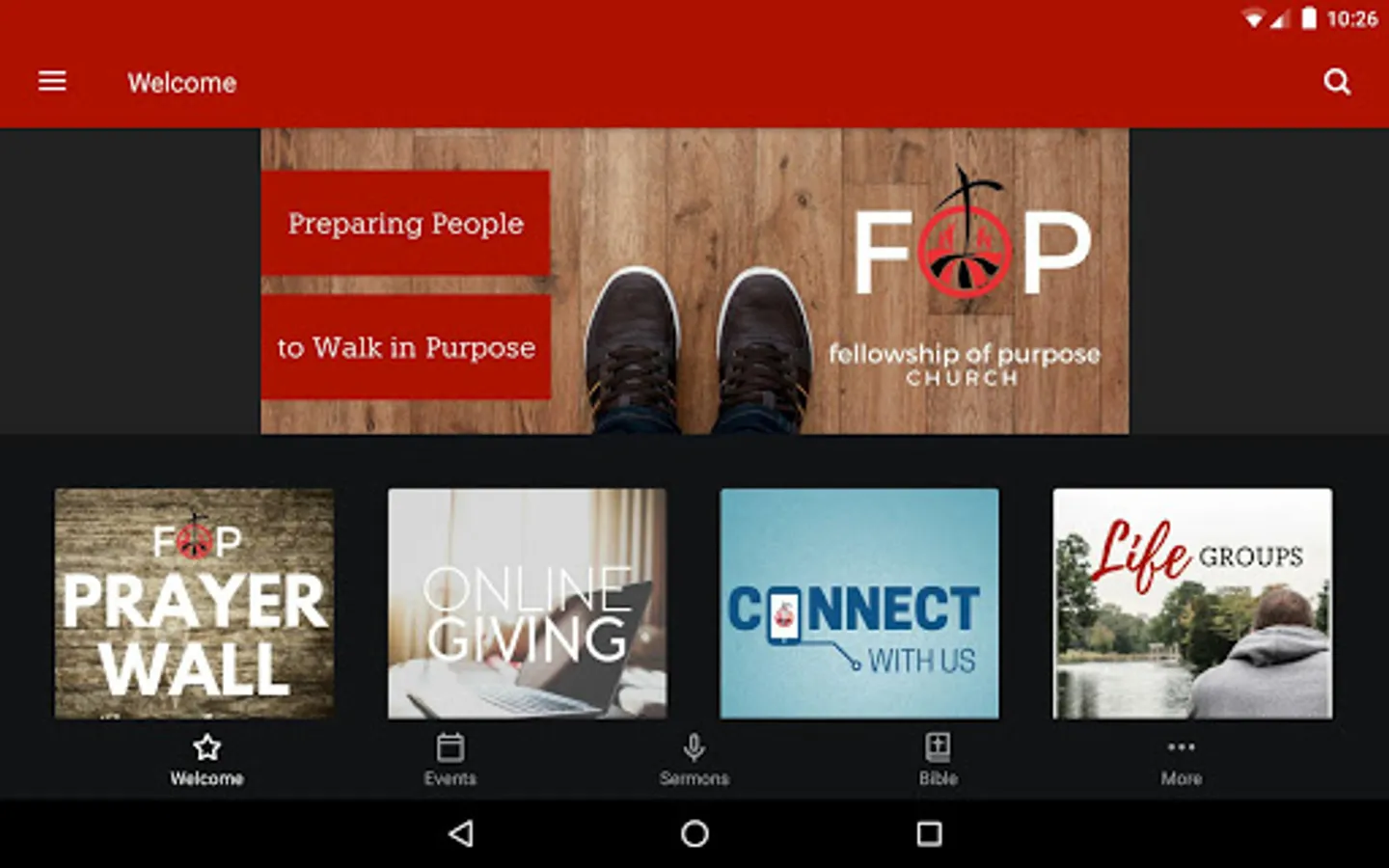 The Fellowship of Purpose Church App was created with the Subsplash App Platform.