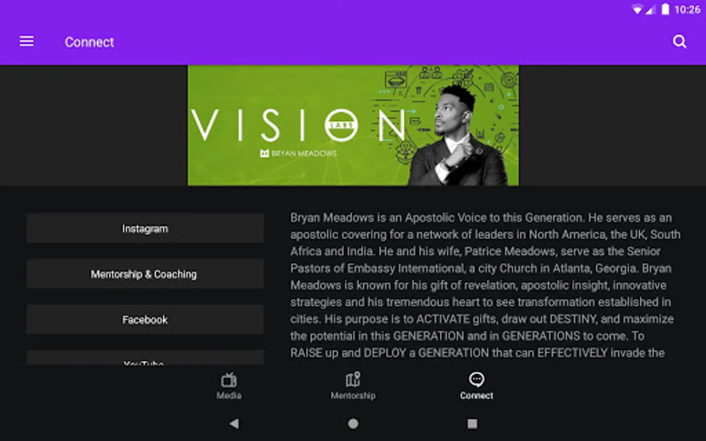 The Bryan Meadows App is finally here! Bryan Meadows is an Apostolic Voice to this Generation. He serves as apostolic covering for a network of leaders in North America and India. He serves as the Senior Pastors of Embassy International, a city Church in Atlanta, Georgia. Bryan Meadows is known for his gift of revelation, apostolic insight, innovative strategies and his tremendous heart to see transformation established in cities. In 2007 he begun a work called Kingdom Campus Ministries in Atlanta, Georgia. He formed an international network of Next Generation Kingdom leaders in 2009, called Jubilee International Ministries, and a center for apostolic covering called Alliance of Ambassadors. In 2017, Bryan Meadows and the Embassy Leadership team, not only birthed out one but two new campuses in the Atlanta area. Embassy North and Embassy West. His purpose is to ACTIVATE gifts, draw out DESTINY, and maximize the potential in this GENERATION and in GENERATIONS to come. To RAISE up and DEPLOY a GENERATION that can EFFECTIVELY invade the MARKETPLACE.