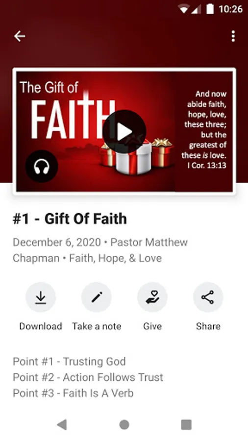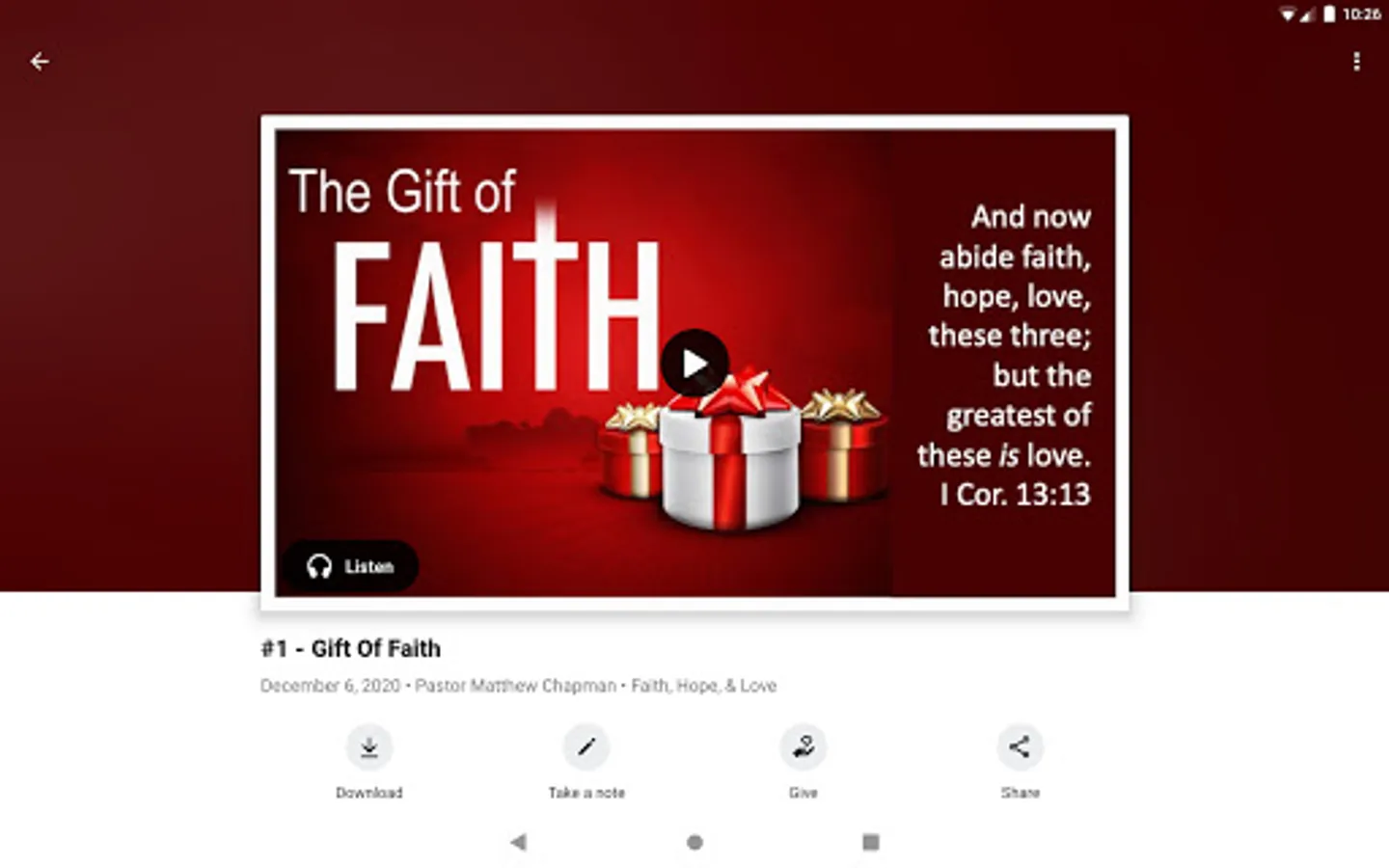 This app will help you stay connected with the day-to-day life of our church. With this app you can: watch or listen to past messages; stay up to date with push notifications; share your favorite messages via Facebook, YouTube or email; and download messages for offline listening.