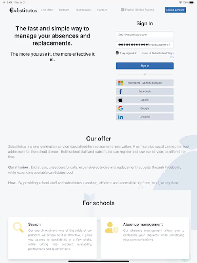 Scolago is a new generation service specialized for replacement reservation: A self-service social connection tool addressed for the school domain. Both school staff and substitutes can register and use our service for free.