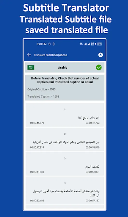 • Translated file easily saved with the desired language in well-formatted srt and vtt files.