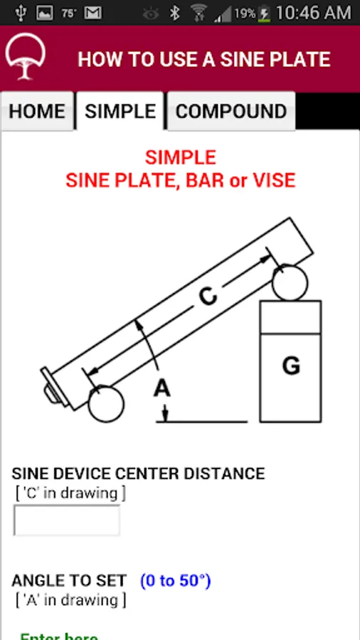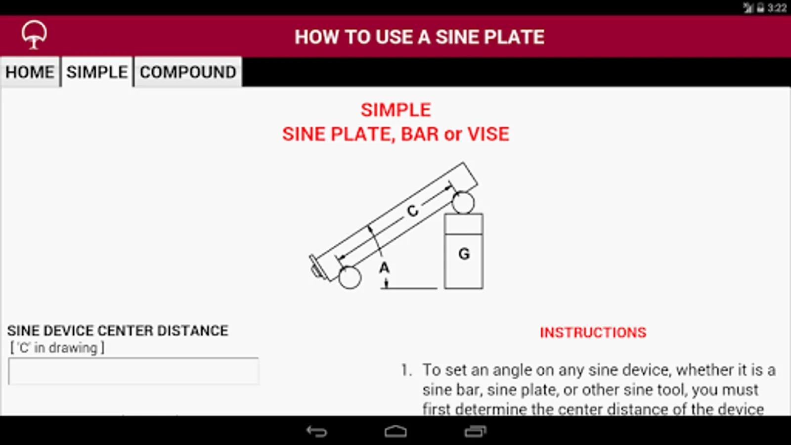 This app gives basic instructions on using a simple or compound sine plate. It also will calculate the required gage block stacks for almost any angle or center distance.