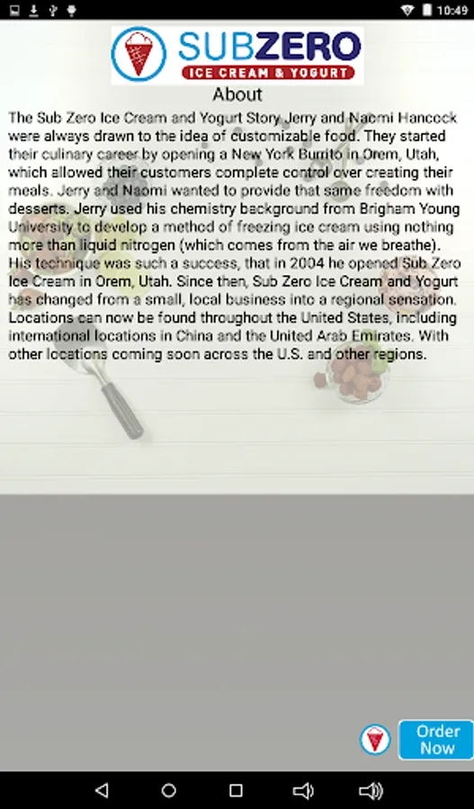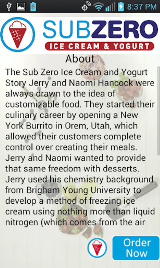 Jerry and Naomi Hancock were always drawn to the idea of customizable food. They started their culinary career by opening a New York Burrito in Orem, Utah, which allowed their customers complete control over creating their meals. Jerry and Naomi wanted to provide that same freedom with desserts. Jerry used his chemistry background from Brigham Young University to develop a method of freezing ice cream using nothing more than liquid nitrogen (which comes from the air we breathe). His technique was such a success, that in 2004 he opened Sub Zero Ice Cream in Orem, Utah. Since then, Sub Zero Ice Cream and Yogurt has changed from a small, local business into a regional sensation. Locations can now be found throughout the United States, including international locations in China and the United Arab Emirates. With other locations coming soon across the U.S. and other regions.