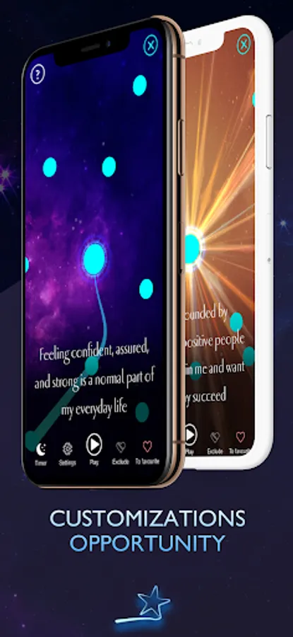 Our application is qualitatively different from the similar ones, drawing in a light space style provides an additional opportunity for meditation. Moving between the "anchors", the role of which the planets play in the universe, the new planet will allow the study of new affirmations. "Anchors" - the ability to have clearly defined landmarks, traveling between the reached points. By listening to audio and reading affirmations, you can tune in to a powerful stream of cosmic energy, improving the internal perception of the world. Our program is designed for meditation and self-hypnosis.