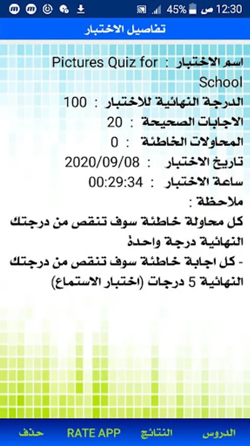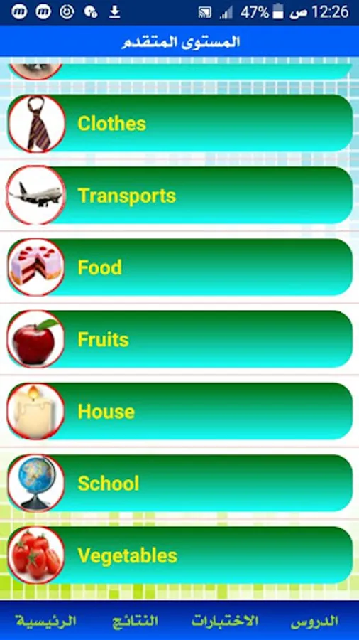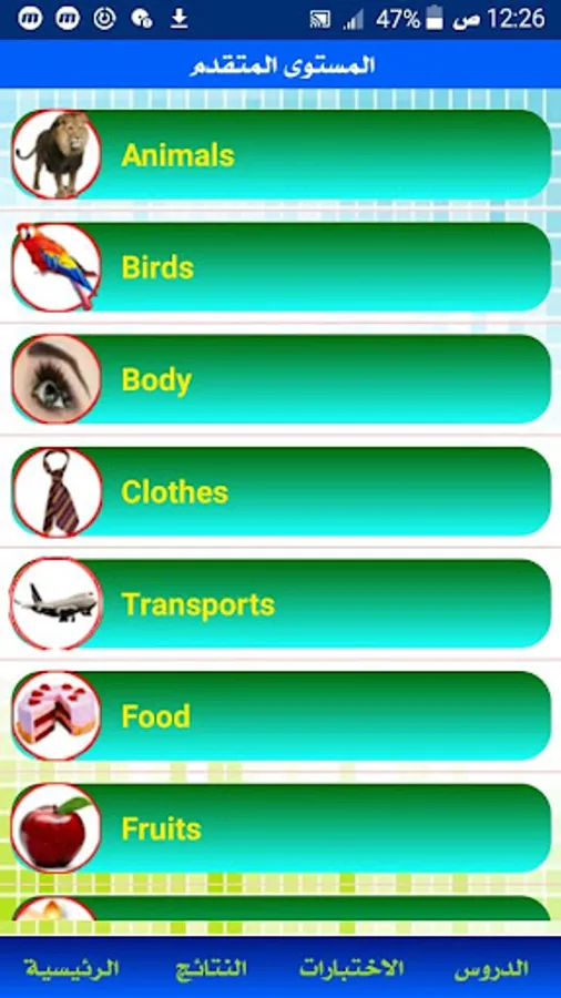 ❖ Learning by exam: After learning vocabulary with sound and image, you can test yourself and measure the level of what you have learned. The tests varied to include all auditory, visual and written learning skills and are commensurate with all individual abilities and differences, which are: (spelling test, picture test, sound test and meaning test)
