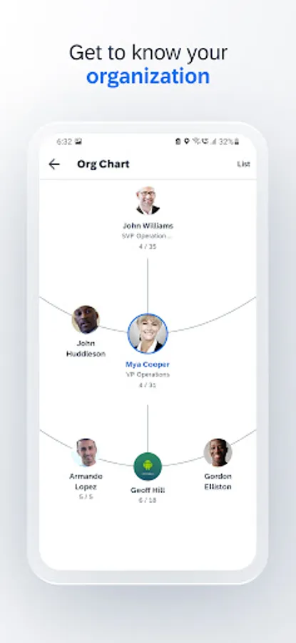 • View your company’s organization chart to see how everyone is connected, including direct reports, matrix reports and new hires.