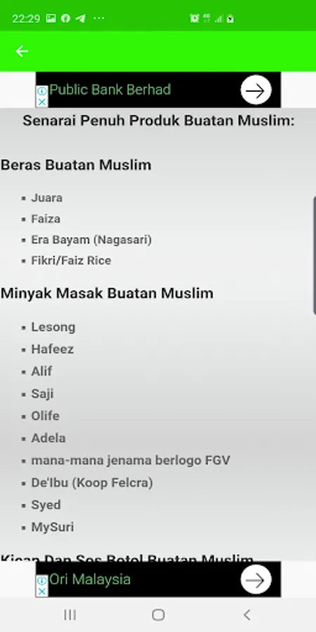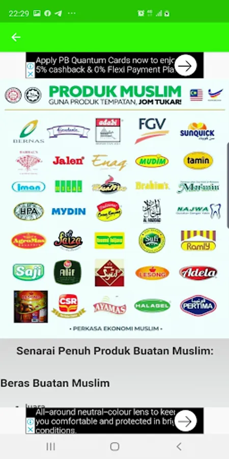 Apps ini juga memaparkan senarai produk-produk muslim yang terkini yang boleh dibeli oleh pengguna-pengguna muslim di Malaysia.