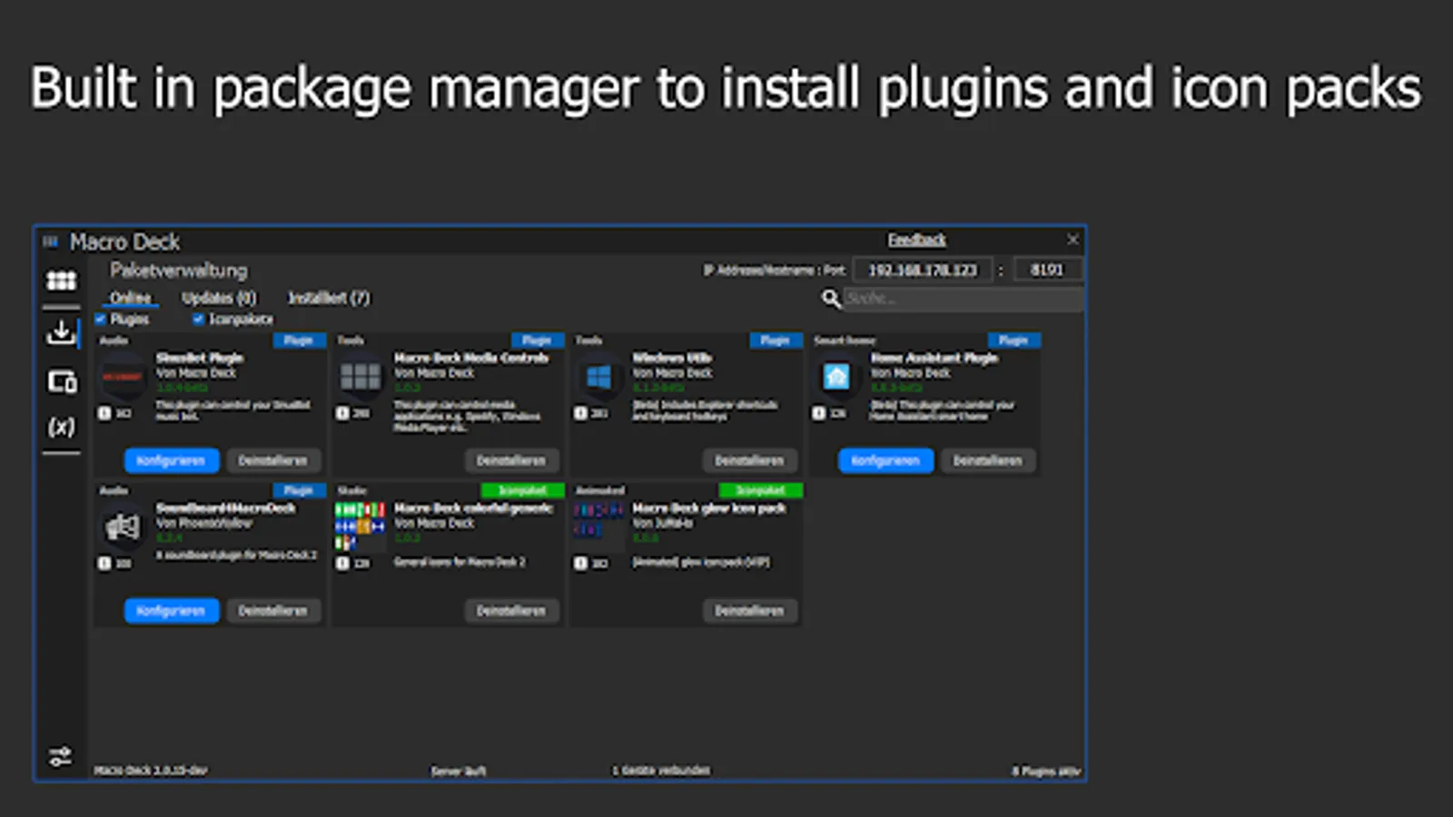 - Built in package manager (to download plugins and icon packs)