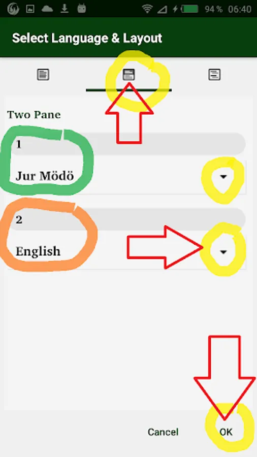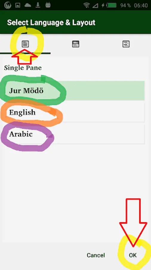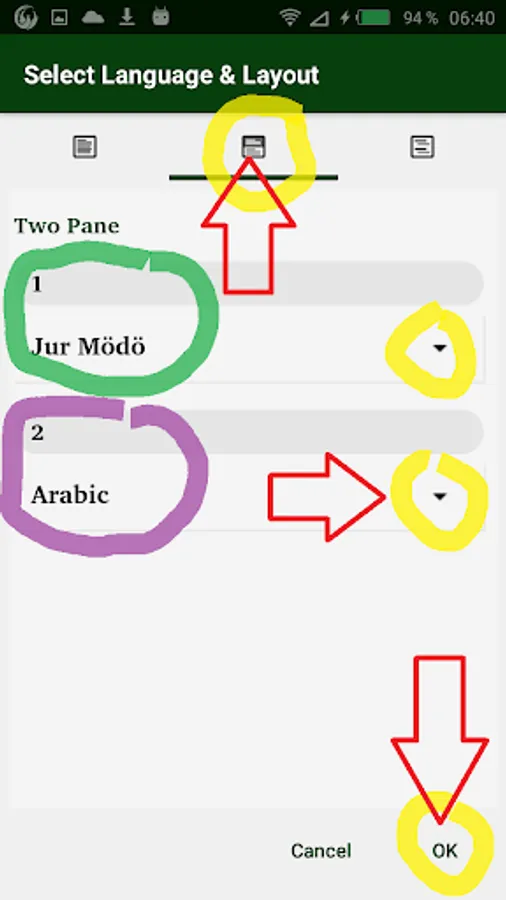 - "two panes" to display the Jur Modo at the top and the English or Arabic version at the bottom