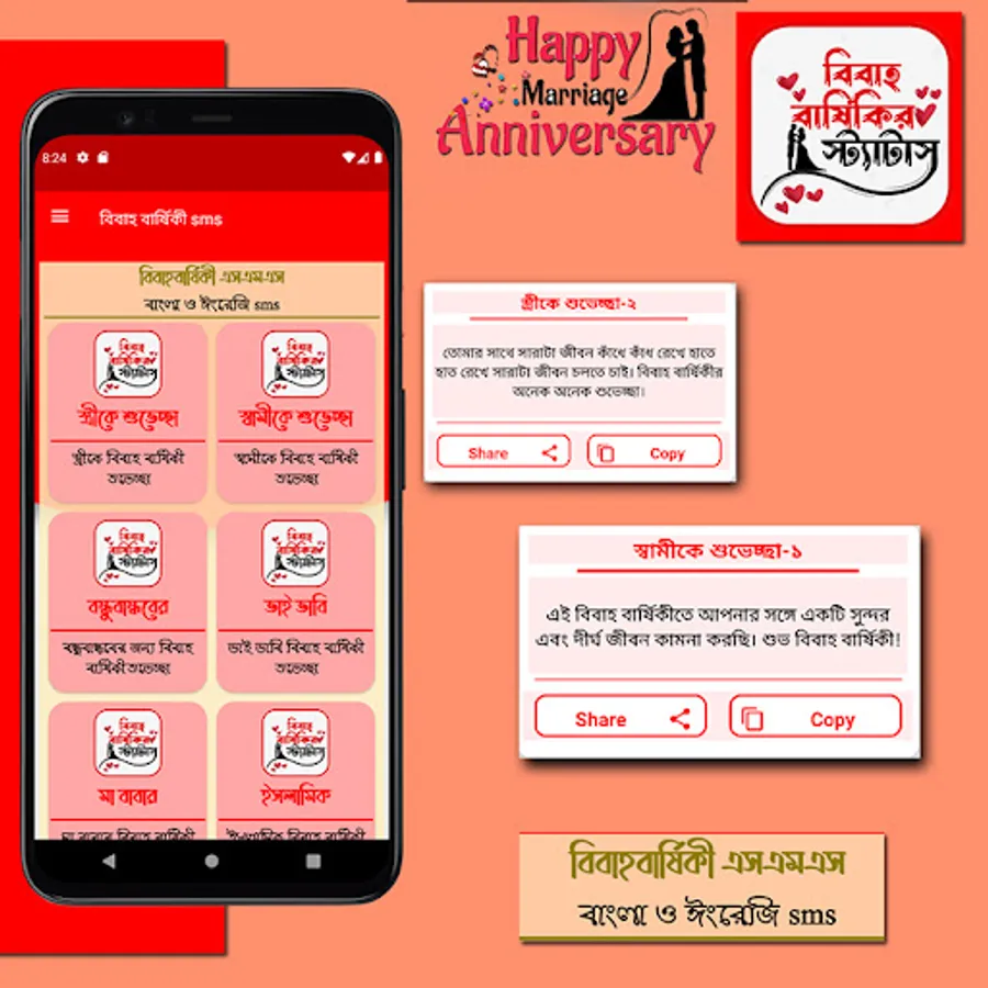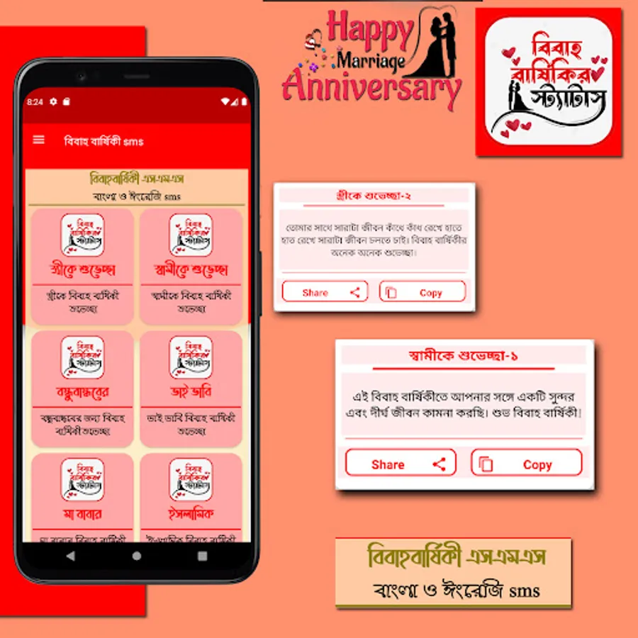 This list of happy anniversary wishes, messages and quotes is here to help, whether it's a first wedding anniversary or 50th. Whether you're searching for a romantic message or Marriage anniversary status bangla, Anniversary Wishes has it all. Choose from various categories, customize your message, and share it directly from the app via social media or messaging platforms. Surprise your partner, friends, or family members with beautiful anniversary wishes that will warm their hearts and make their special day unforgettable. your anniversary is a special day to tell your partner how much you love them. This list of happy anniversary wishes is here to help anyone who has ever gotten stuck on what special wishes to write in a happy anniversary card, or what to say on that special day. If you’re struggling with what to write in an anniversary card, some happy anniversary quotes or messages will help you put your feelings into words. Download Anniversary Wishes now and spread the joy of love and togetherness on this cherished occasion.