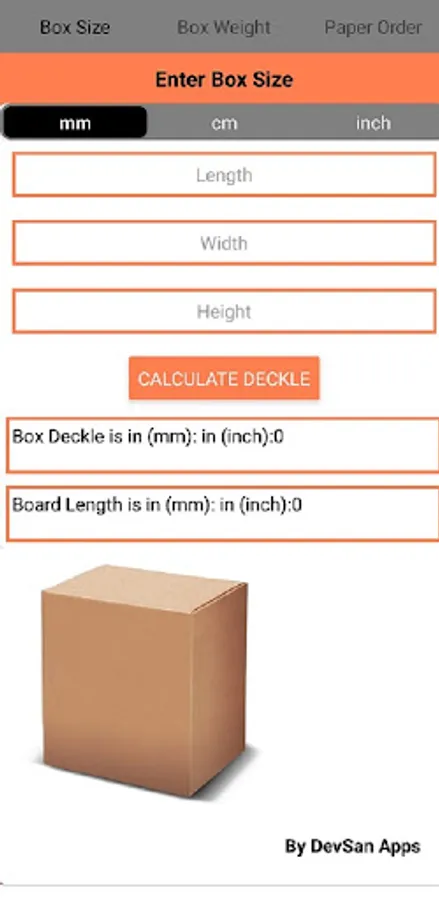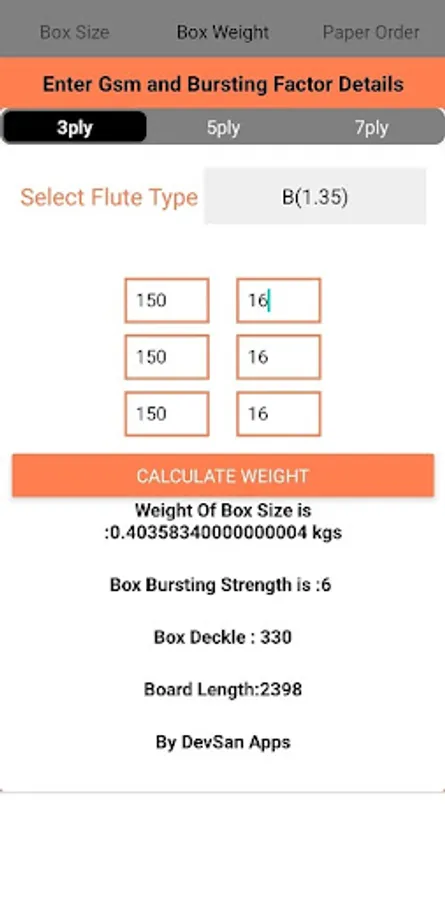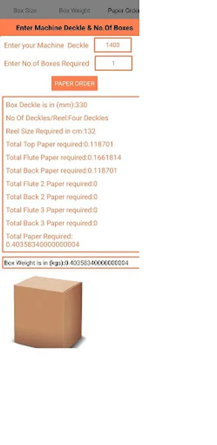 This application is used for all corrugated box manufacturing industries for calculating the box deckle and board length and box weights according to the different sizes given by the customer and also calculate the BS of the Box and finally even the quantity of paper should be ordered for given quantity by the customer