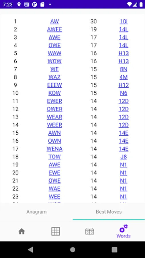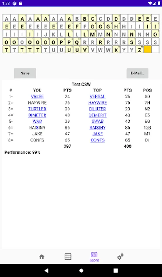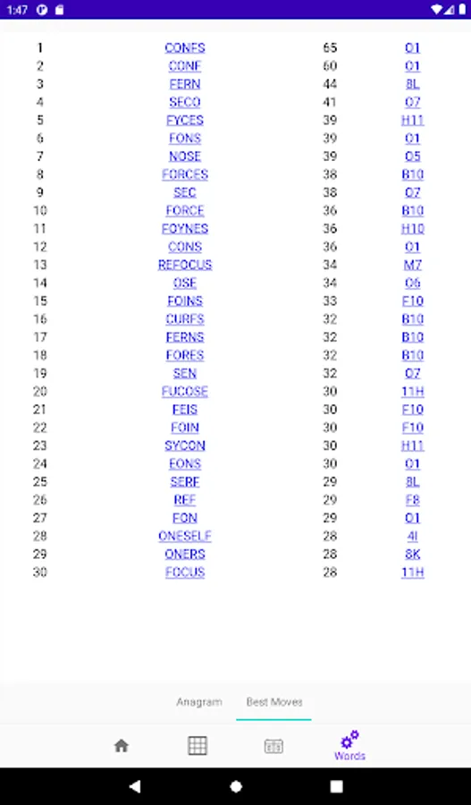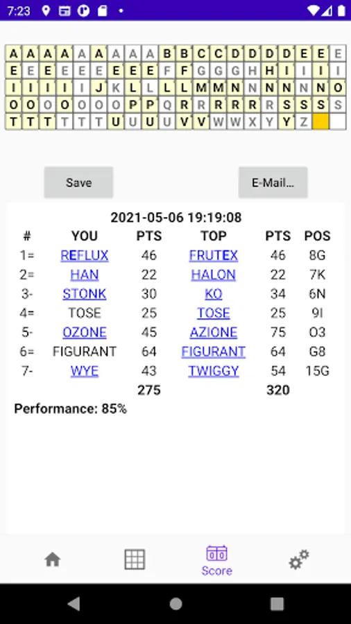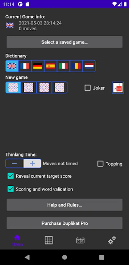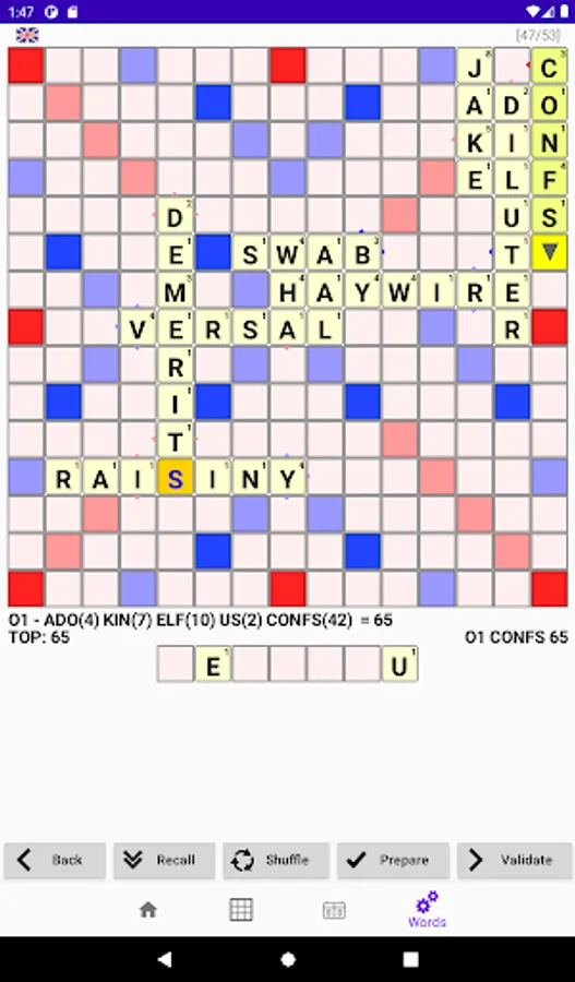 At the beginning of the game, the app displays 7 letters drawn from the "bag". You then try to find the highest scoring word and place it on the game board. When you have decided or at the end of the thinking time (when you are playing a timed game), you tap "Validate" to enter your move. At this point the app announces the "max score", i. e. the word that gives the highest score in context and places it on the board. You only score the number of points corresponding to the word that you have found. The app then draws the new letters from the bag, and the game continues.