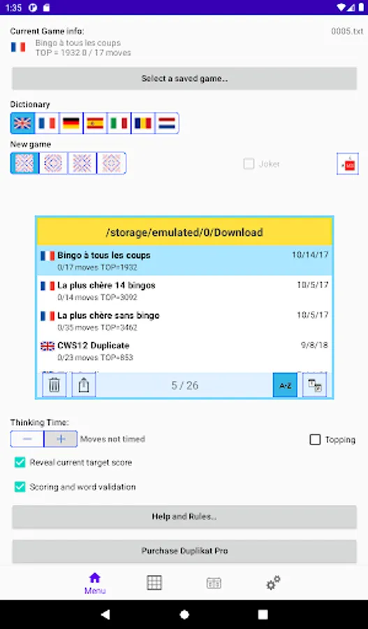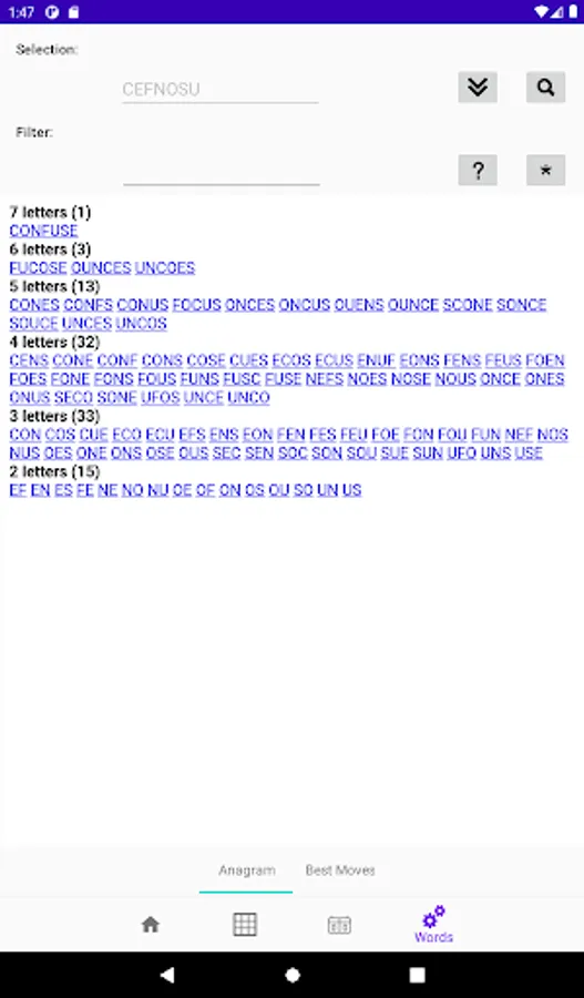 - The Words tab allows you to search for words that can be formed from letters in the current rack, taking into account the constraints specified in the "Filter" area. With Duplicate Pro, you can edit the "Selection" area. This can help you complete a crossword puzzle.