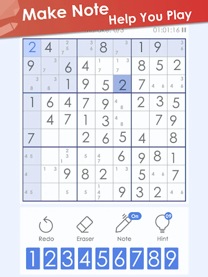 This number grid game has the feature of adding or removing notes by enabling memos during play. Make your journey to become a number puzzle master easier. Also, you can also use: Undo and Hint