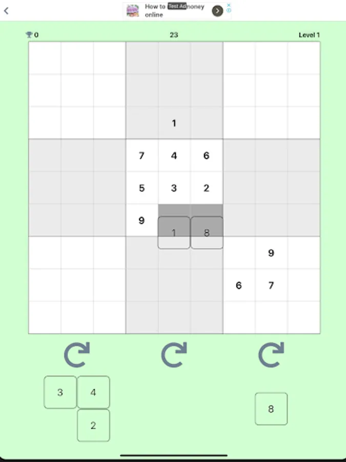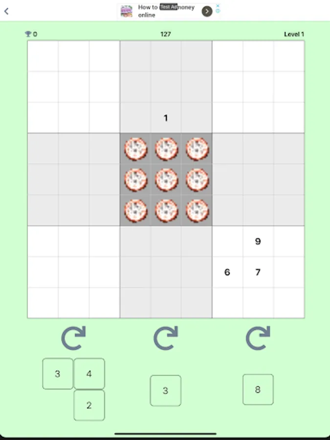 If you piece together 9 different numbers in a horizontal line or vertical line or 3*3 block, those numbers are crushed and grids become empty.