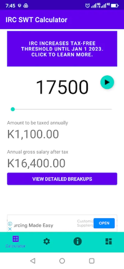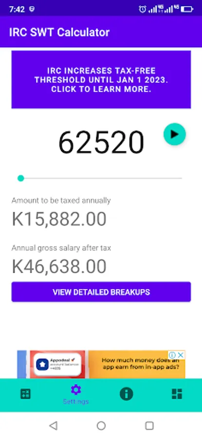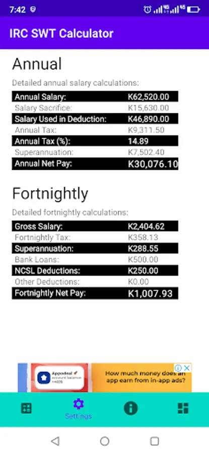 The PNG IRC SWT Calculator is an android application designed to help one determine how much take home pay s/he has left in the account after tax and other deductions. Most people do not understand how Tax Calculations work, especially on Domestic Salaries and Wages. So my aim with this application is to take the technicalities aside and just let the user see how much s/he will take home. In doing so, I've researched, read and understood clearly how the IRC SWT Calculations are done and as a result of this, I am presenting this application.