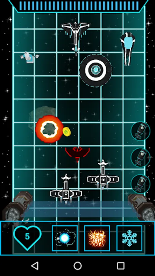 In space, you will defeat different enemies with bombs and "The Laser" which has many types of ammunition.