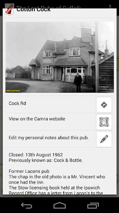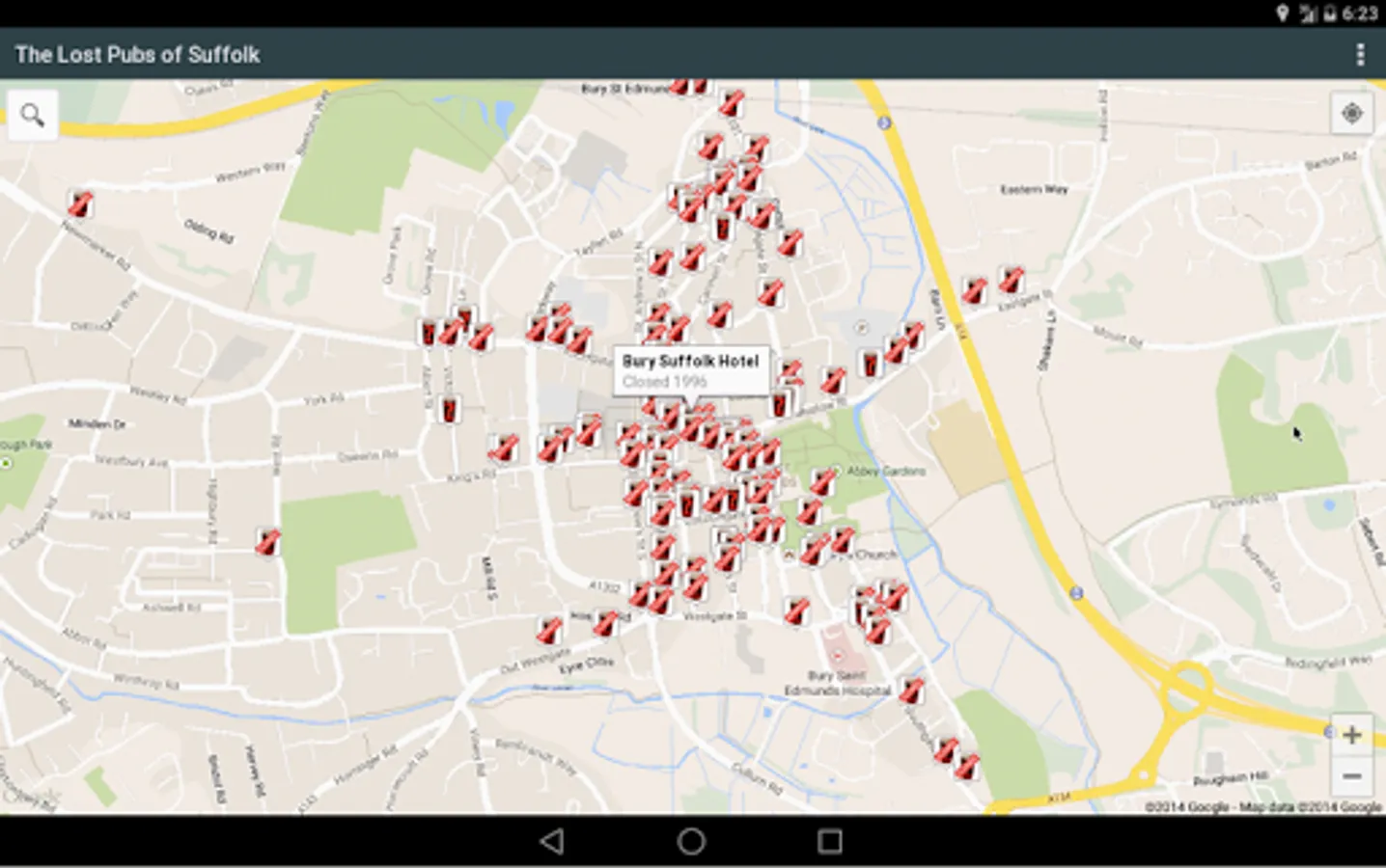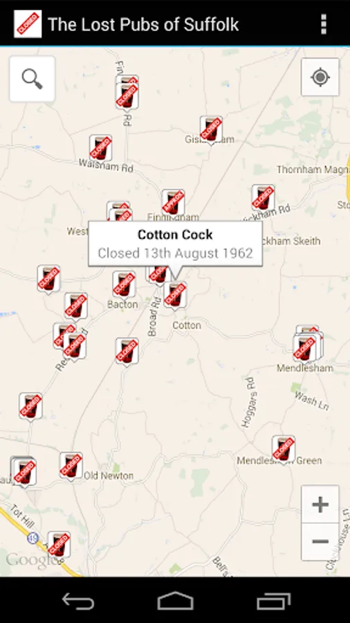 An app designed for people with an interest in the history of Suffolk's pubs. This is a map showing the location of every positively identified former pub in the county, as well as a number of buildings we think may have been pubs.