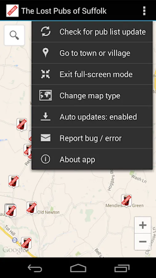 * Some devices running the Gingerbread version of Android don't show a menu button at the top of the app. Menu functions are still available from the device's hardware menu button. Those few devices lacking a hardware menu button will not be able to access some of the more advanced features of the app, but pubs data will be available.