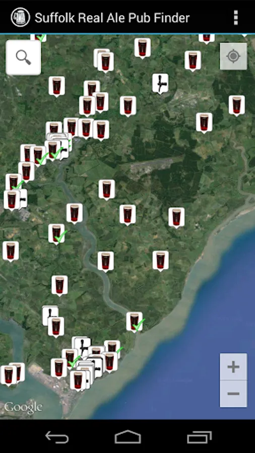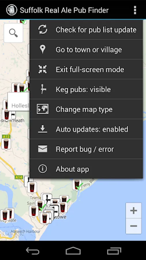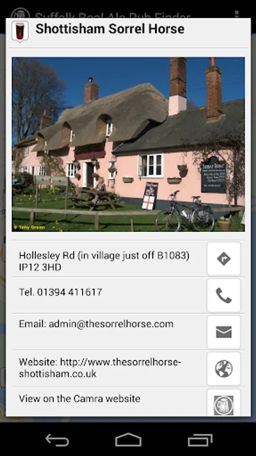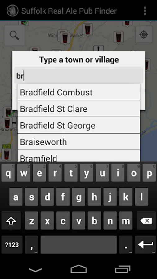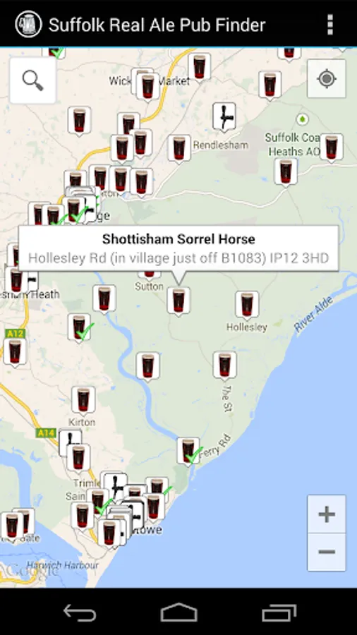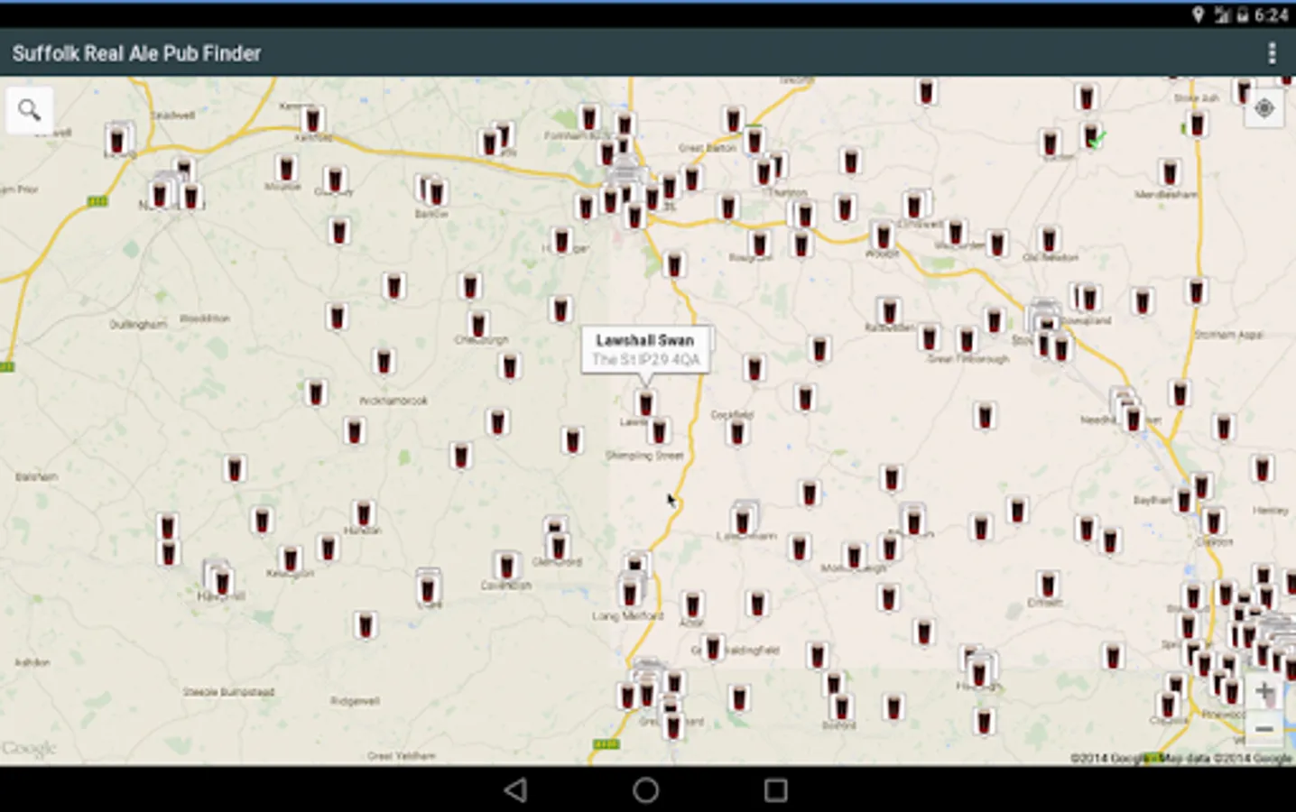 All nearby pubs selling Real Ale are shown on the map; tap on a pub for its name, then on its name for more information and the opportunity to get directions to the pub.