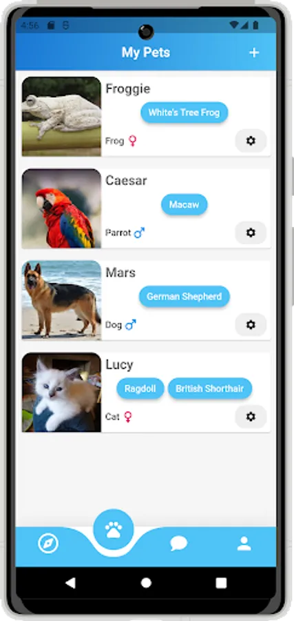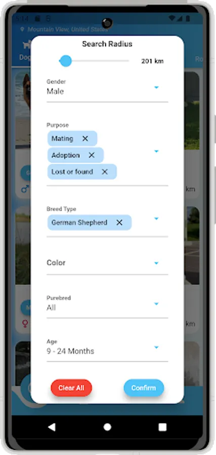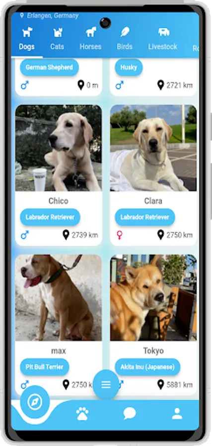 Purposes that are included in this app are: breeding, finding friends, adopting, rescuing and finding lost pets.