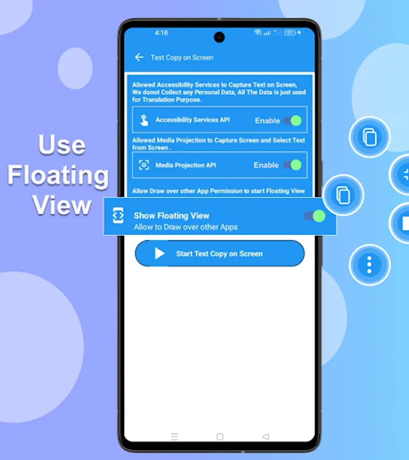Screen Text scanner gets text from the mobile screen with just one click with OCR technology (optical character reader). Like other text recognition apps, our text copier app saves all the cut text to the clipboard and you can save it for future use and also translate text to different languages.