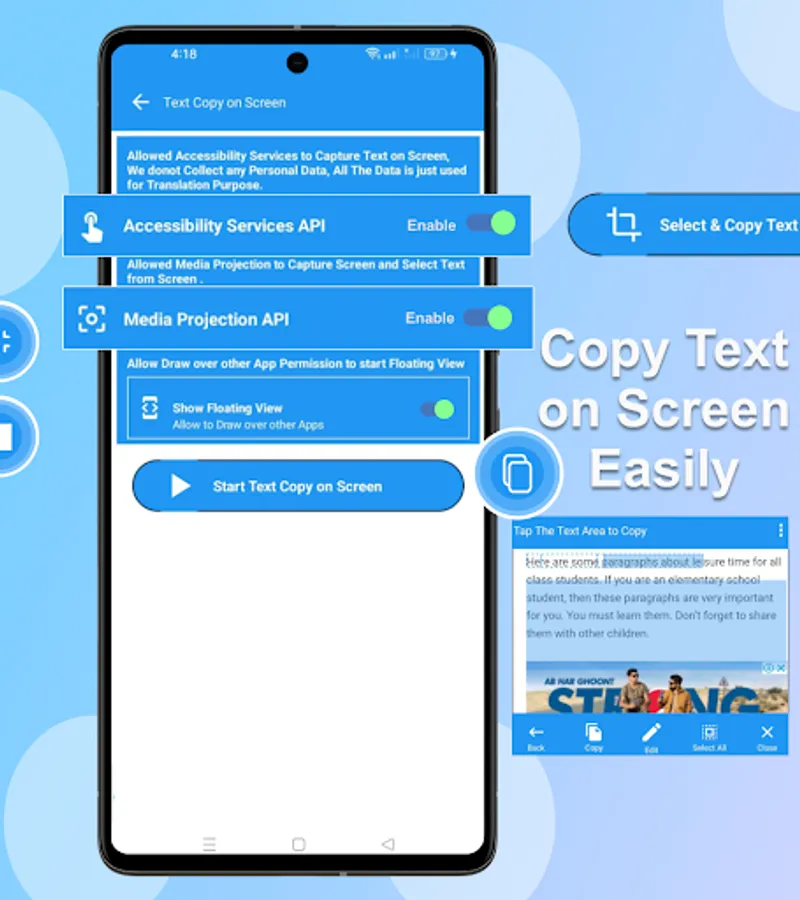 Copy text on screen is the best text extractor app from the screen in multiple languages translation supporting format. Copy every text from the mobile screen to the clipboard with accuracy and every social apps and newspaper and picture, website and use this text for many.