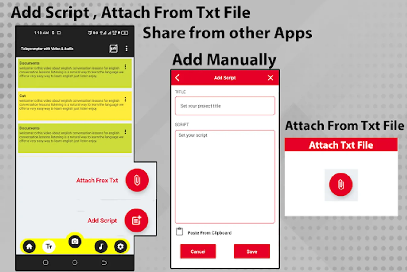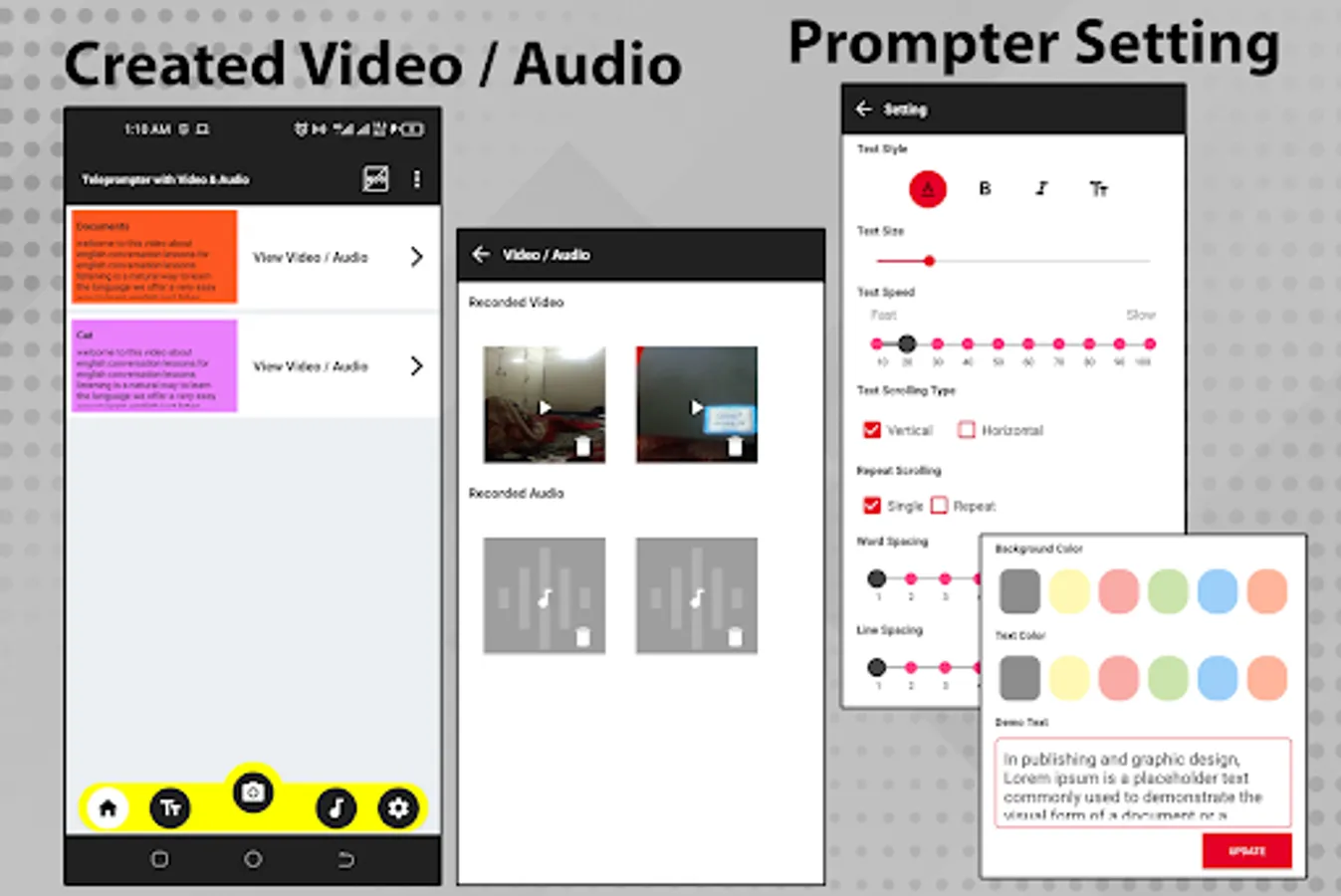 With teleprompter camera app you can easily read your script and at the same time record video or audio of the script easily. Video Teleprompter app provides best option to capture video clip script. Teleprompter camera app for android provides both features to make video or audio clip with script voice. Teleprompter mirror show script in front of camera screen so the person can speak and record video clip easily. With the help of tele prompter app you can easily explain your content to your audience rather than making notes and other staff. You can easily customize video teleprompter for your own needs, font color, speed of script moving and other staff.