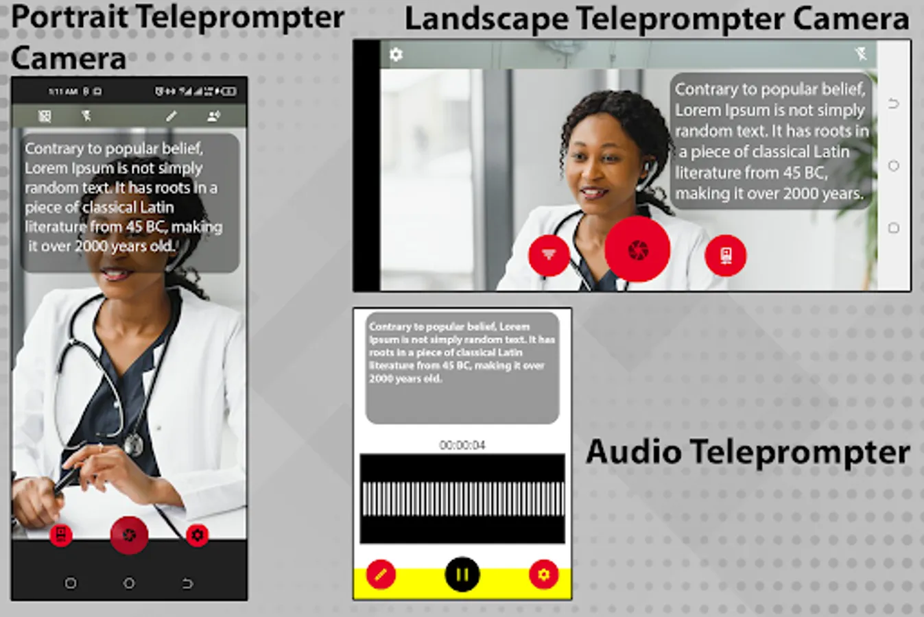 Teleprompter camera allows you to quickly take a block of script and start prompting it. Video Teleprompter app used for presentations, lectures, broadcasters, filmmakers, musicians & singers, business professionals, or any public speaking. You can read a script while recording yourself using the front & back camera. Simply press record and read the script as it scrolls down on the screen. As the script scrolls next to the camera lens, so you look like you're talking to your audience when you are actually reading.