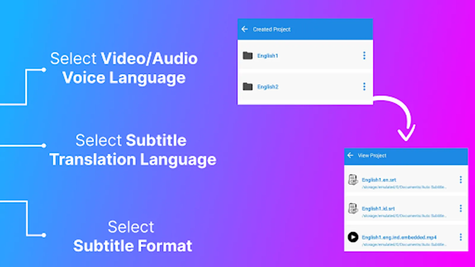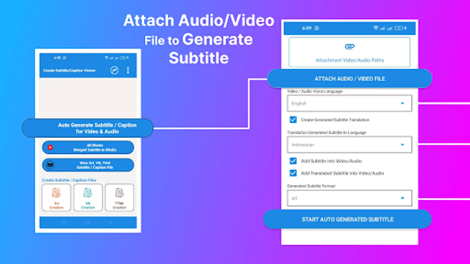 Auto transcribe video to subtitle app let you create srt, vtt subtitle file by using artificially intelligence and also generated translated subtitle to any media file like video or audio. You can play the video and open any subtitle file with this nice tools.