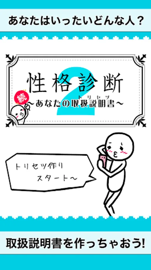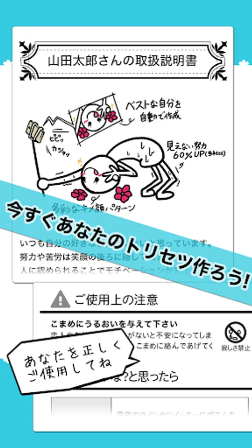 This app based on personality diagnosis to create your Torisetsu for free is a free fun app where you can enjoy anyone to feel free at any time.