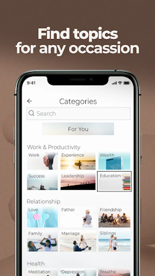 Positive Affirmations Daily includes a wide range of topics such as motivation, positive thinking, self- growth, happiness, relationships, productivity, affirmations, gratitude, dealing with hard times.