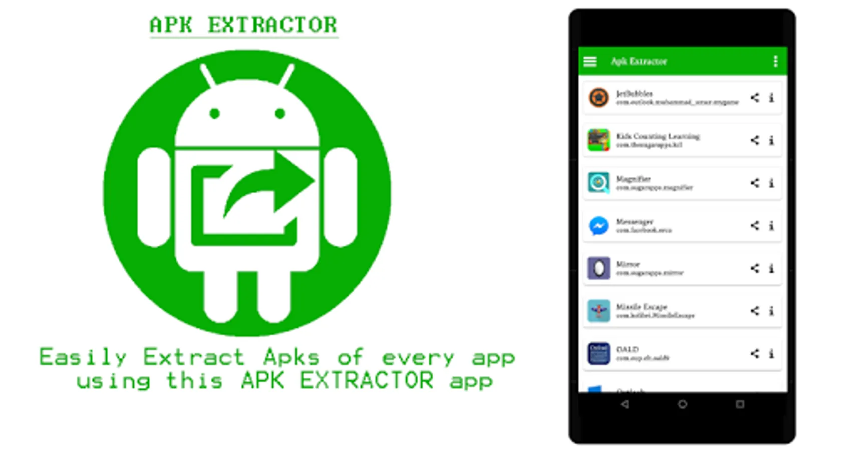 It can extracts all application including system applications. Apk extractor will help you to get the info of application and share the extracted apks of apps. Simple click the app name and it will extract the apk and save it in device storage. You can easily see the saved apks by click on the right menu.