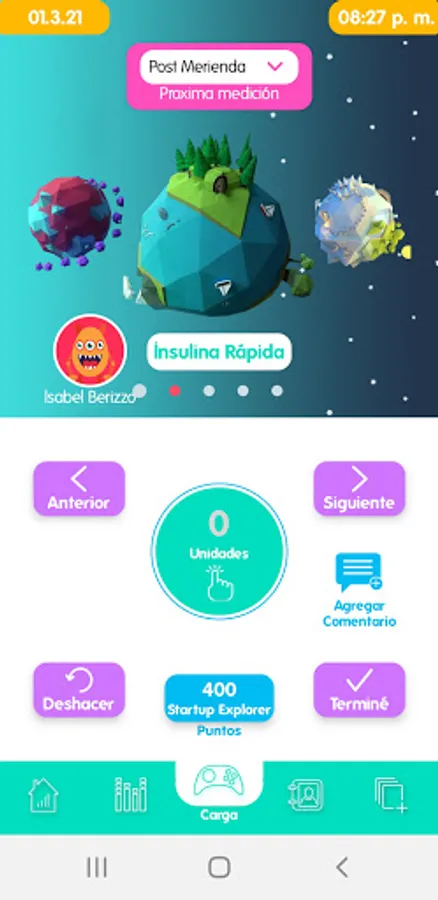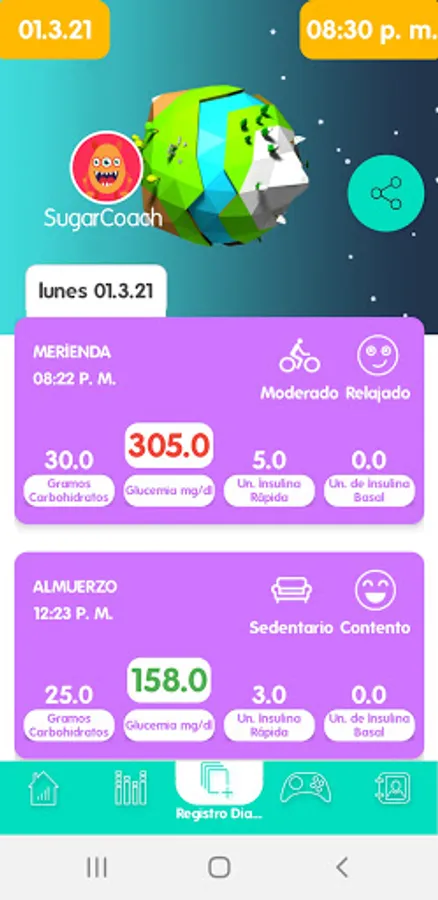 With an interface that simulates a space trip between planets Glycemia, Insulin, Carbohydrates, you will be able to register even your State of Mood!