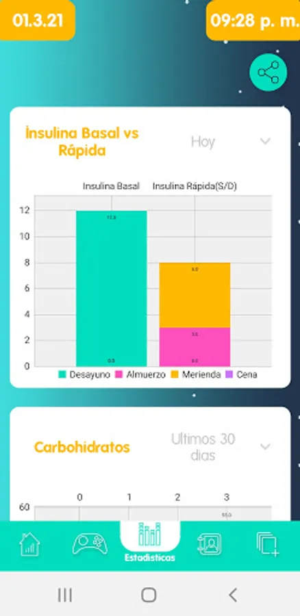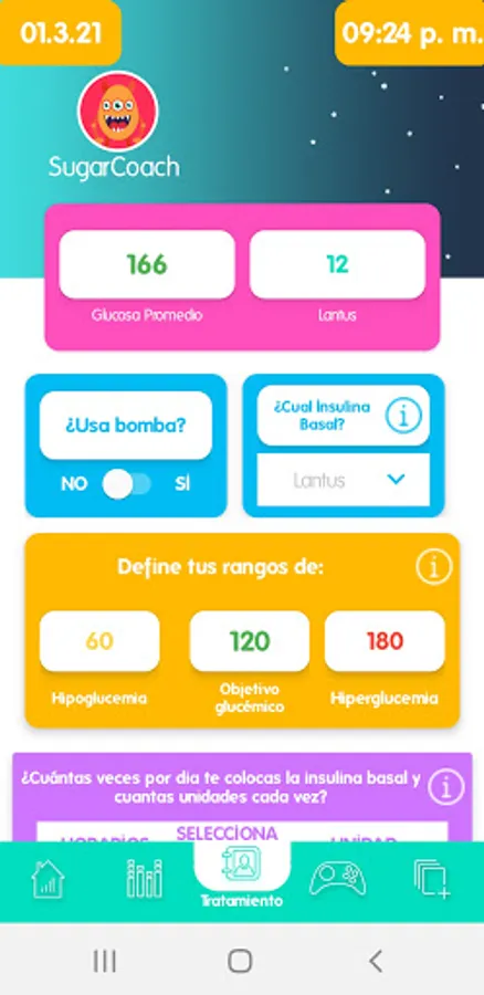 SugarCoach has a special form so you can record the details of your treatment, such as types of insulin, times you take it, glycemic target, correction for sensitivity and bolus, among other information. Everything is neat and clear!