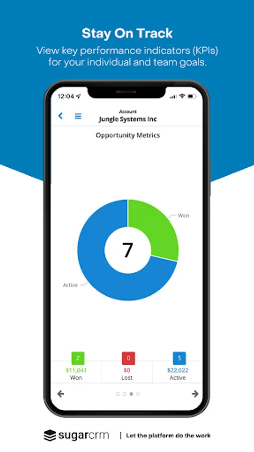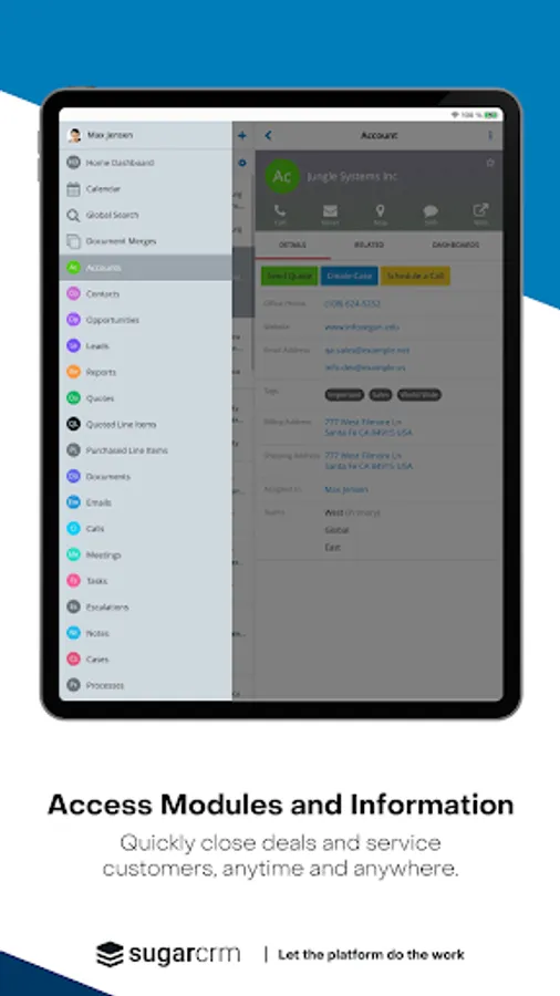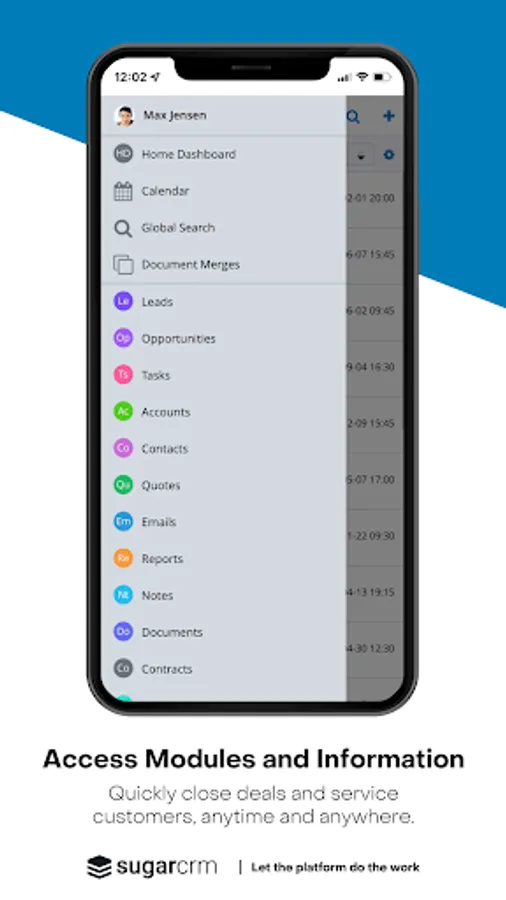 With the SugarCRM mobile app, you can take your business processes and CRM data on the go, including access to contacts, accounts, leads, activities, and custom Sugar modules.
