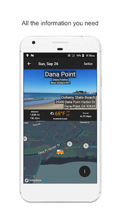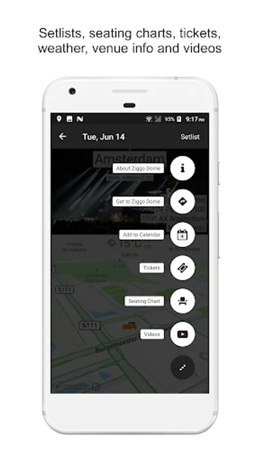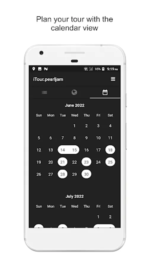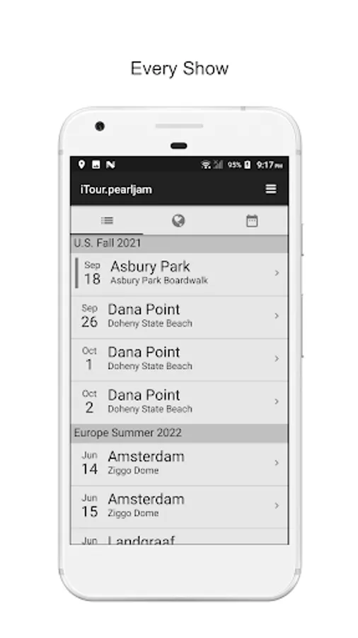 This application helps you find all the information that you need for the current Pearl Jam tour. Access directions, setlists, seating charts, showtimes, tickets, local weather and videos for every show in the run.