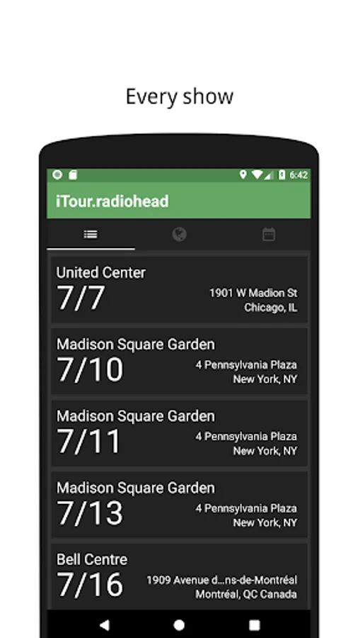 This application helps you find all the information that you need for the current Radiohead tour. Access directions, setlists, seating charts, showtimes, tickets, local weather and videos for every show in the run.