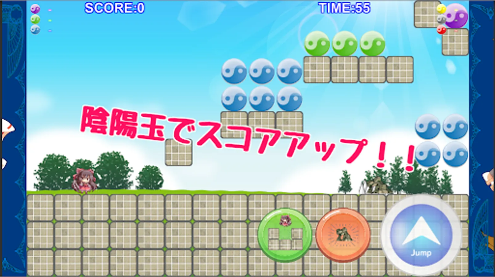 Select a character and start the stage. If you take the Yin-Yang Orb, the score will increase, and the stage will be cleared when the torii is the goal.