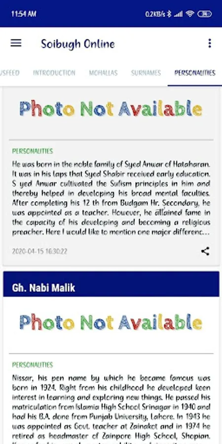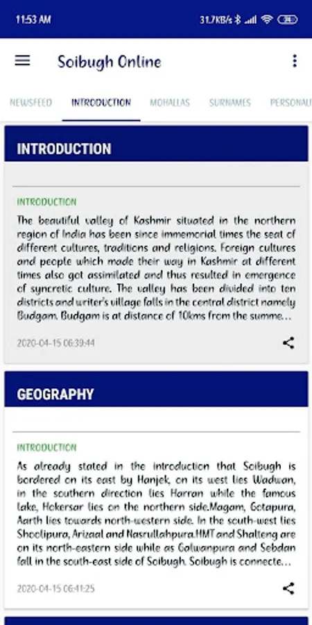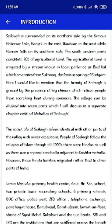The main purpose of this app is to digitalize the past of soibugh so it will be easy for us to know more about our ancestors, tradition, culture, social life etc. Not only this, the app will serve the latest updates, happening, events related to our village. The most information available in the app is from Mr Mehraj ud din Bhat and Syed Suheel Bukhari both PG's from Kashmir University.