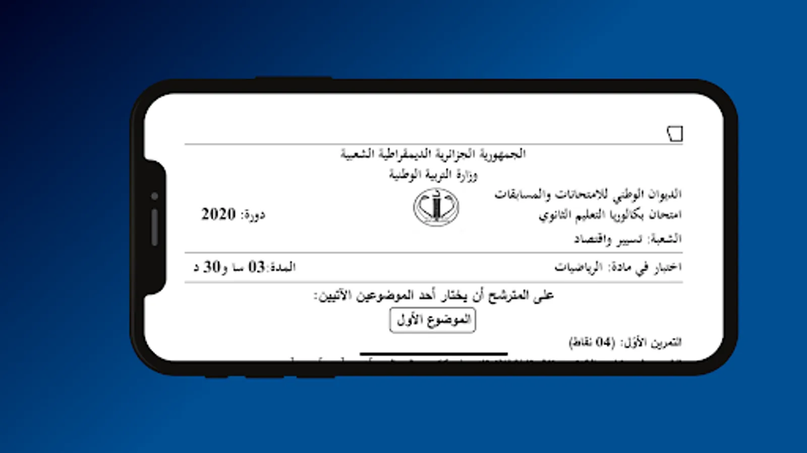 All Algerian national Bac exams in one app. This app contains the official Algerian bac (bac algérien) exams from 2008 to 2021(bac 2008, bac 2009, bac 2010, bac 2011, bac 2013, bac 2014, bac 2015, bac 2016, bac 2017, bac 2018, bac 2019, bac 2020, bac 2021, bac 2022) in all categories with the official solutions presented in a clean way to help students directly access the database.