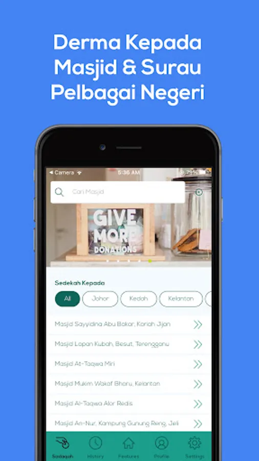 Sedekah kepada masjid/surau semudah A,B dan C. Kebaikan bersedekah itu amat banyak, hapuskan dosa, ditambah keberkatan, dijanji ganti dan banyak lagi. 100% sedekah anda akan ke masjid pilihan.