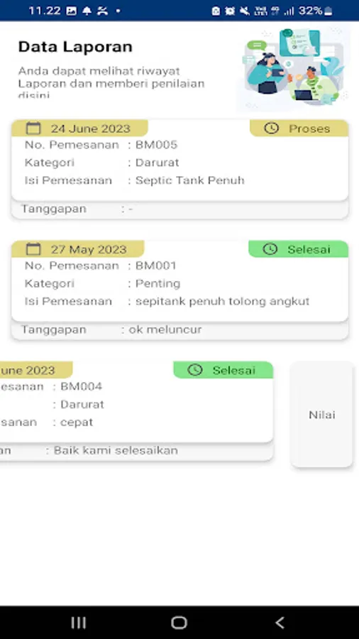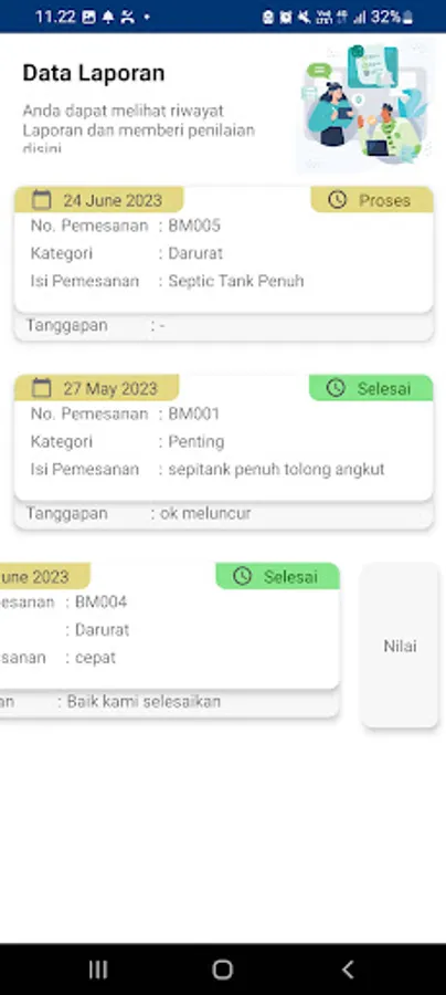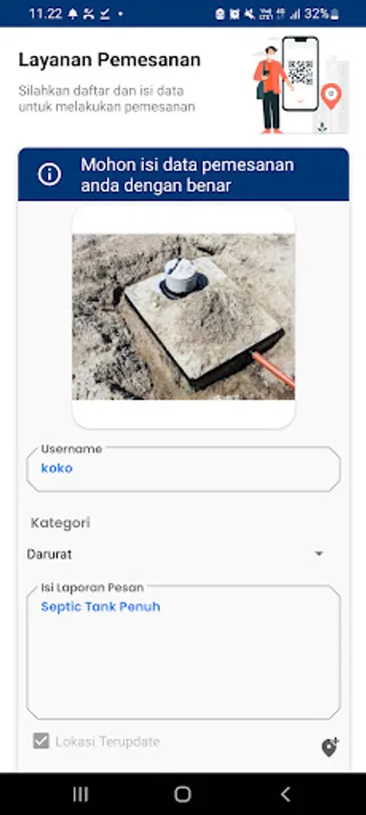 - Ordering Sanitation is a feature for using this service accompanied by the customer's name, the order category consists of (ordinary, moderate, emergency), and addresses that are integrated with google maps